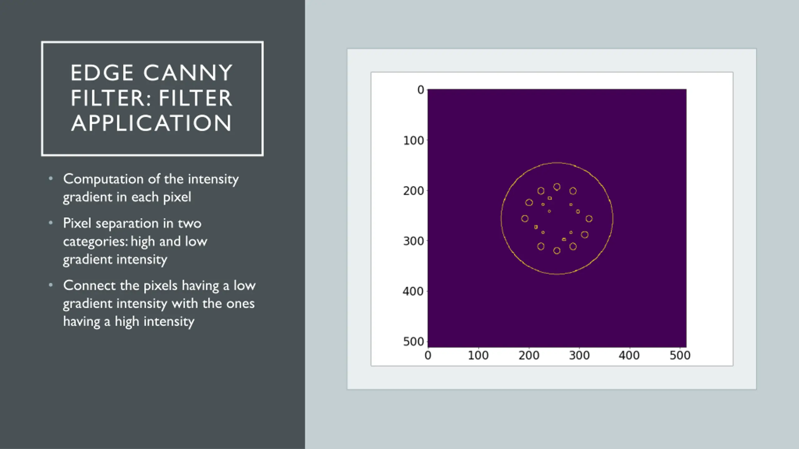 EDGE CANNY FILTER: FILTER APPLICATION Computation of the intensity gradient in each pixel Pixel separation in two categories: high and low gradient intensity Connect the pixels having a low gradient intensity with the ones having a high intensity