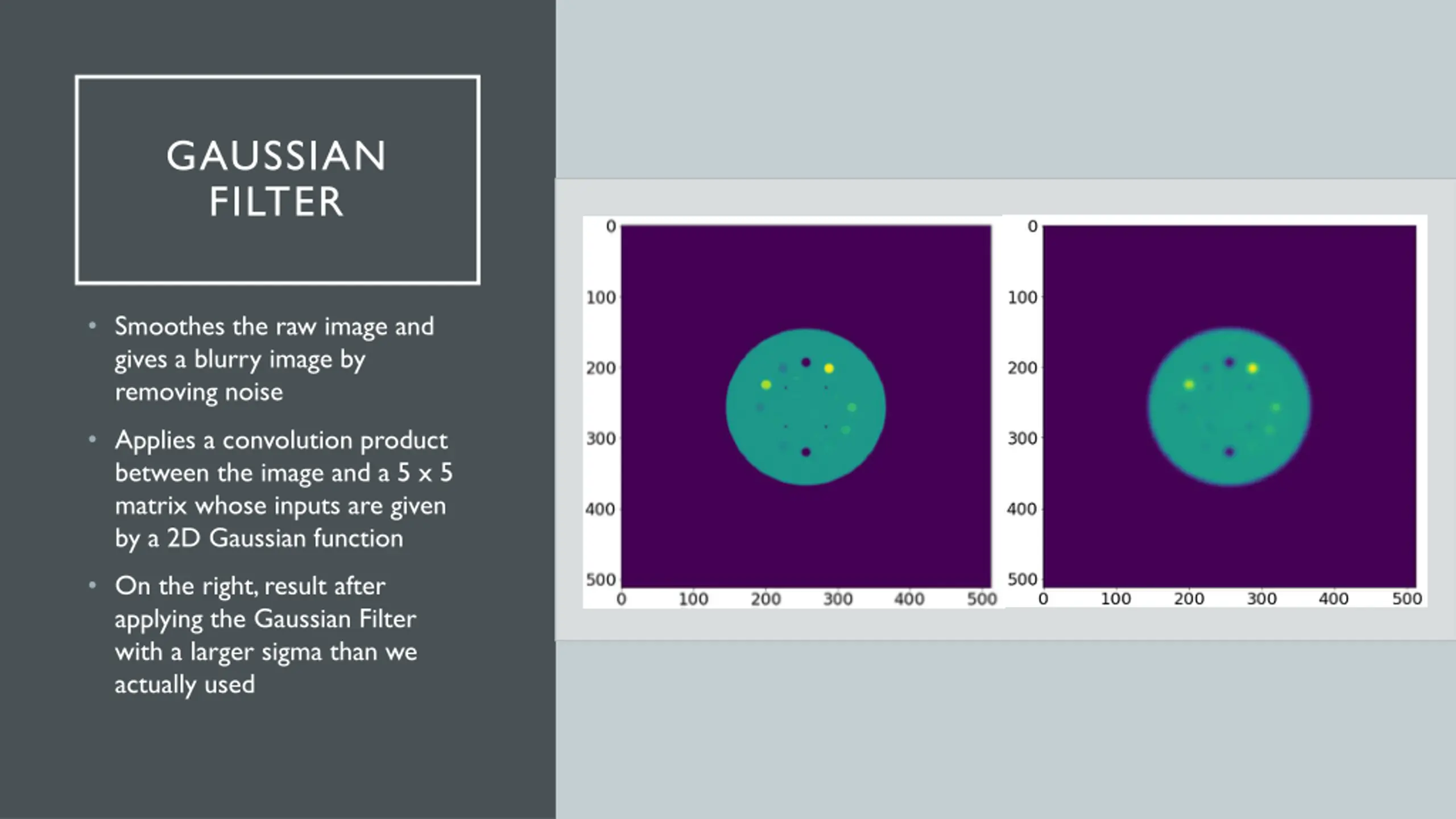 GAUSSIAN FILTER Smoothes the raw image and gives a blurry image by removing noise Applies a convolution product between the image and a 5 x 5 matrix whose inputs are given by a 2D Gaussian function On the right, result after applying the Gaussian Filter with a larger sigma than we actually used