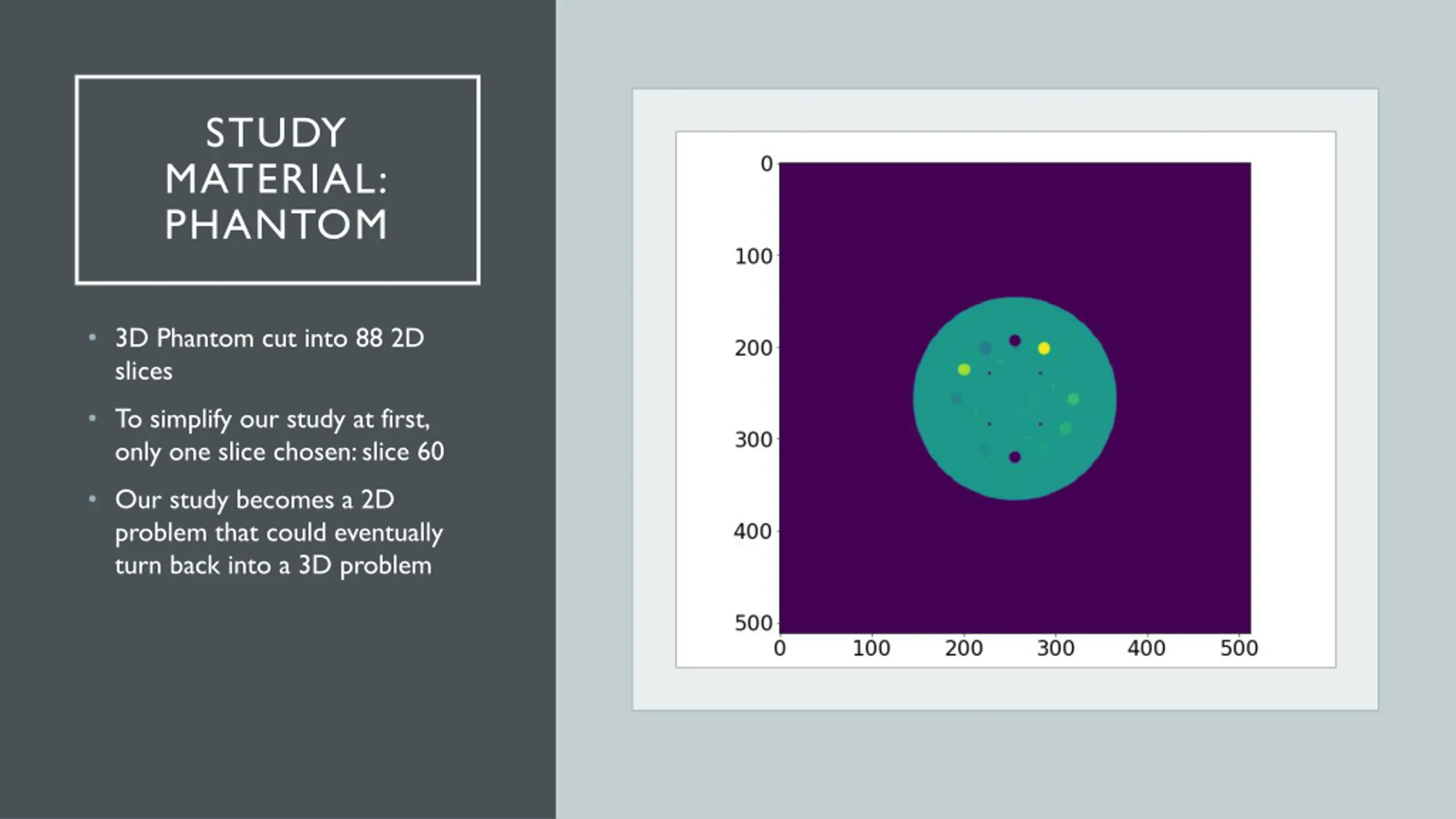 STUDY MATERIAL: PHANTOM 3D Phantom cut into 88 2D slices To simplify our study at first, only one slice chosen: slice 60 Our study becomes a 2D problem that could eventually turn back into a 3D problem