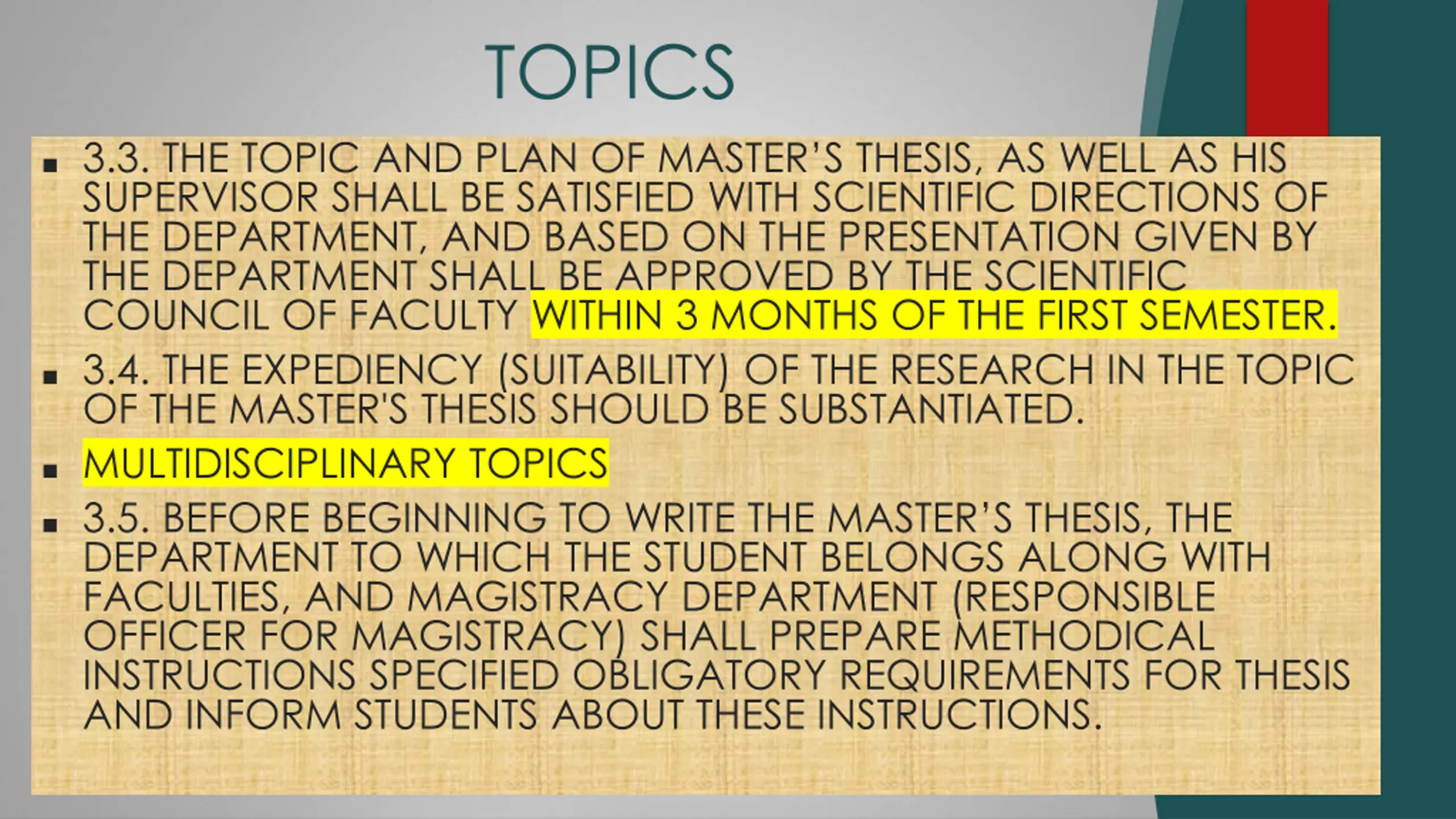 TOPICS 3.3. THE TOPIC AND PLAN OF MASTER S THESIS, AS WELL AS HIS SUPERVISOR SHALL BE SATISFIED WITH SCIENTIFIC DIRECTIONS OF THE DEPARTMENT, AND BASED ON THE PRESENTATION GIVEN BY THE DEPARTMENT SHALL BE APPROVED BY THE SCIENTIFIC COUNCIL OF FACULTY WITHIN 3 MONTHS OF THE FIRST SEMESTER. 3.4. THE EXPEDIENCY (SUITABILITY) OF THE RESEARCH IN THE TOPIC OF THE MASTER'S THESIS SHOULD BE SUBSTANTIATED. MULTIDISCIPLINARY TOPICS 3.5. BEFORE BEGINNING TO WRITE THE MASTER S THESIS, THE DEPARTMENT TO WHICH THE STUDENT BELONGS ALONG WITH FACULTIES, AND MAGISTRACY DEPARTMENT (RESPONSIBLE OFFICER FOR MAGISTRACY) SHALL PREPARE METHODICAL INSTRUCTIONS SPECIFIED OBLIGATORY REQUIREMENTS FOR THESIS AND INFORM STUDENTS ABOUT THESE INSTRUCTIONS.