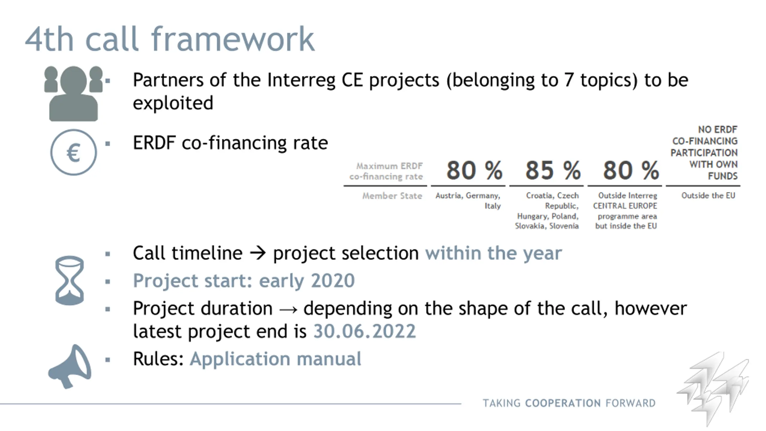 4th call framework Partners of the Interreg CE projects (belonging to 7 topics) to be exploited ERDF co-financing rate Call timeline project selection within the year Project start: early 2020 Project duration depending on the shape of the call, however latest project end is 30.06.2022 Rules: Application manual TAKING COOPERATION FORWARD
