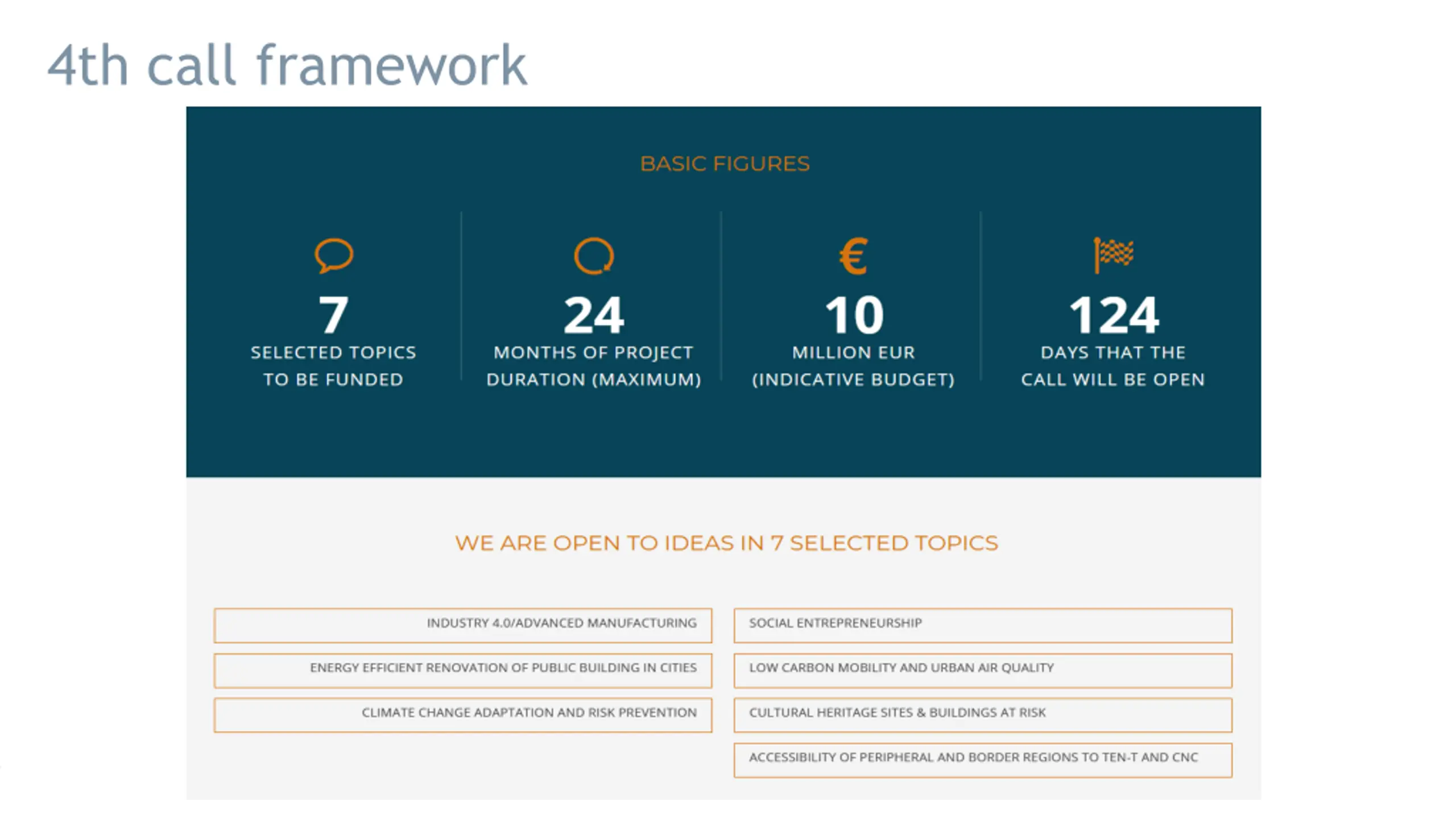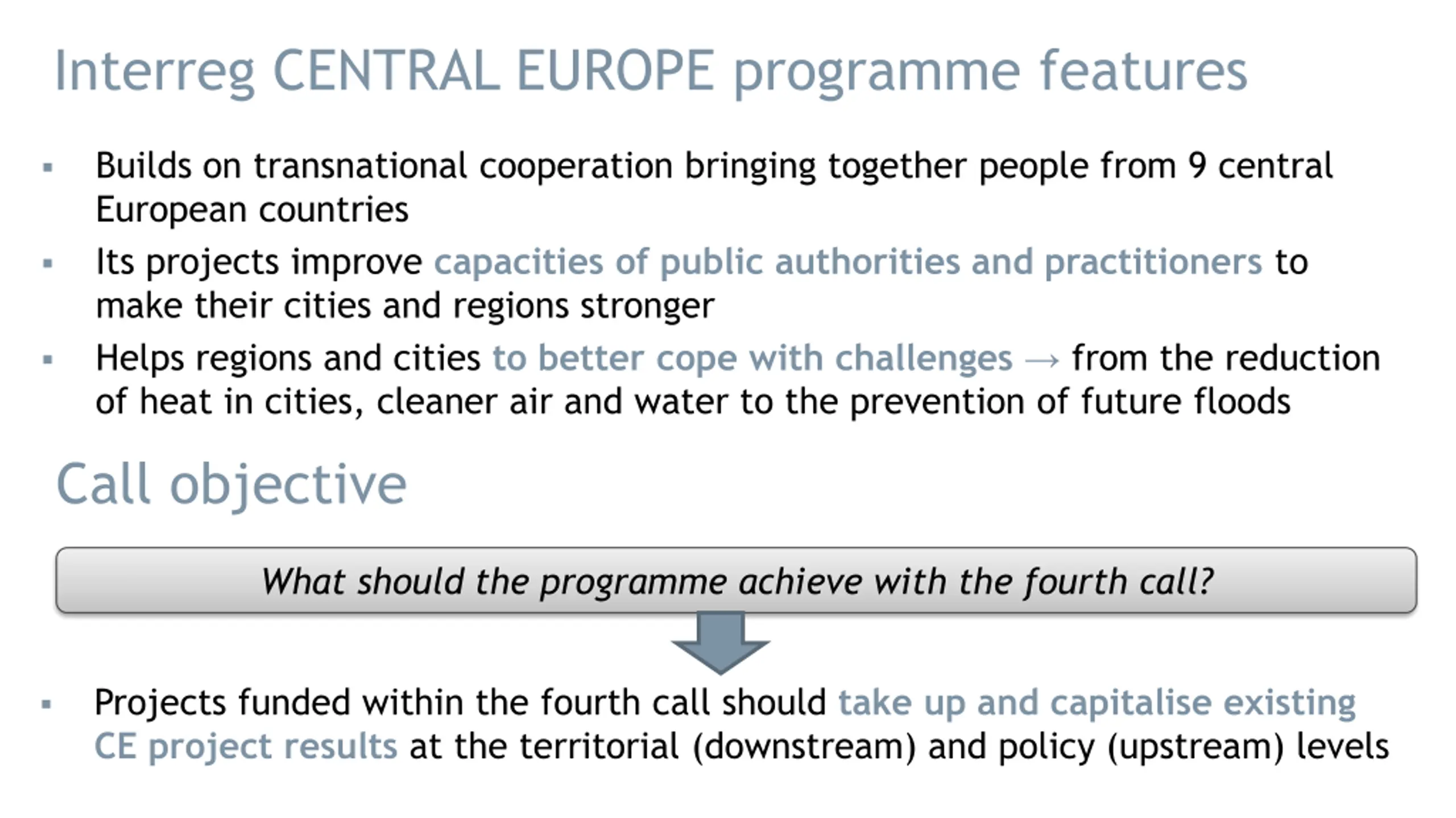 Interreg CENTRAL EUROPE programme features Builds on transnational cooperation bringing together people from 9 central European countries Its projects improve capacities of public authorities and practitioners to make their cities and regions stronger Helps regions and cities to better cope with challenges from the reduction of heat in cities, cleaner air and water to the prevention of future floods Call objective What should the programme achieve with the fourth call? Projects funded within the fourth call should take up and capitalise existing CE project results at the territorial (downstream) and policy (upstream) levels TAKING COOPERATION FORWARD