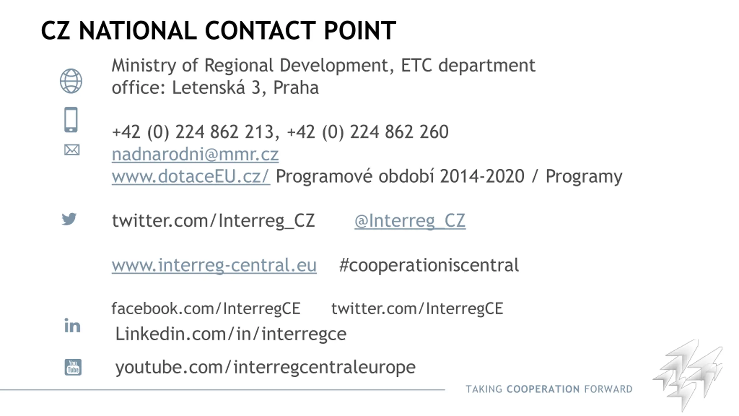 CZ NATIONAL CONTACT POINT Ministry of Regional Development, ETC department office: Letensk 3, Praha +42 (0) 224 862 213, +42 (0) 224 862 260 nadnarodni@mmr.cz www.dotaceEU.cz/ Programov obdob 2014-2020 / Programy twitter.com/Interreg_CZ @Interreg_CZ www.interreg-central.eu #cooperationiscentral facebook.com/InterregCE twitter.com/InterregCE Linkedin.com/in/interregce youtube.com/interregcentraleurope TAKING COOPERATION FORWARD