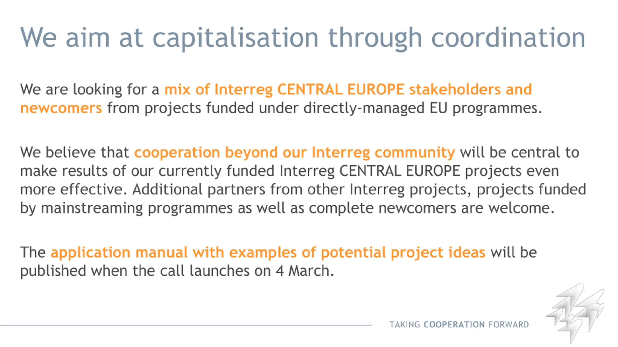 We aim at capitalisation through coordination We are looking for a mix of Interreg CENTRAL EUROPE stakeholders and newcomers from projects funded under directly-managed EU programmes. We believe that cooperation beyond our Interreg community will be central to make results of our currently funded Interreg CENTRAL EUROPE projects even more effective. Additional partners from other Interreg projects, projects funded by mainstreaming programmes as well as complete newcomers are welcome. The application manual with examples of potential project ideas will be published when the call launches on 4 March. TAKING COOPERATION FORWARD