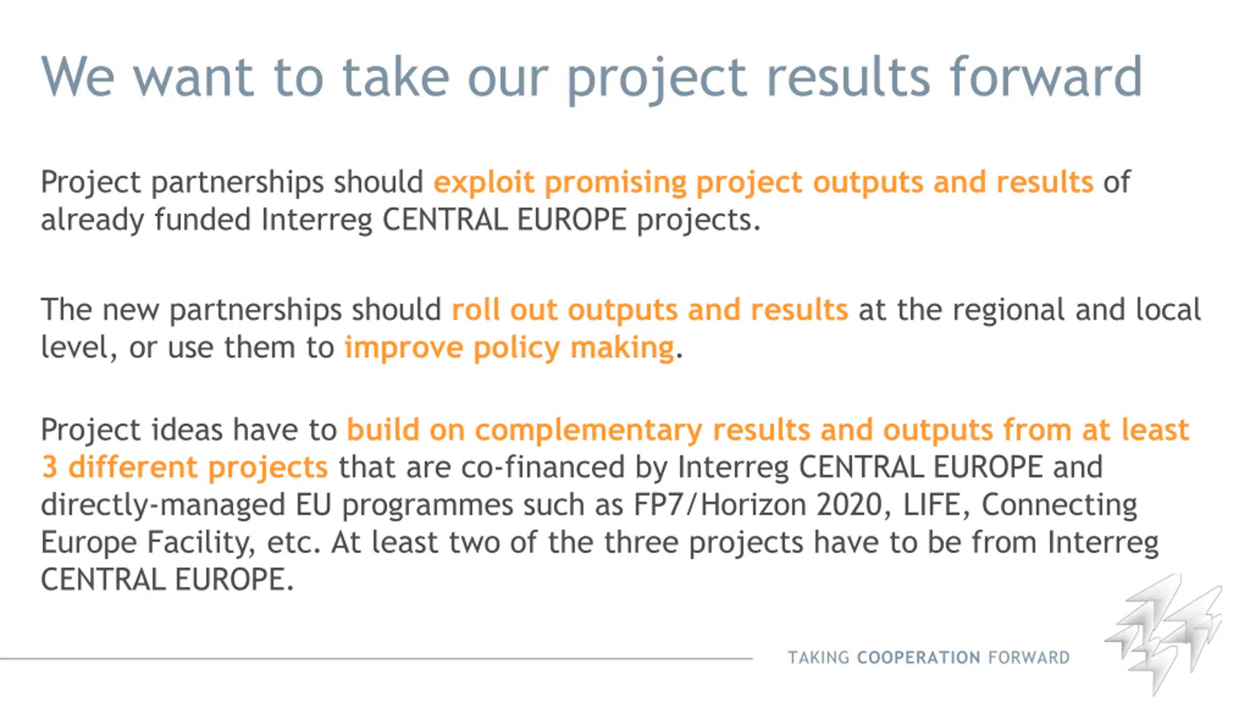 We want to take our project results forward Project partnerships should exploit promising project outputs and results of already funded Interreg CENTRAL EUROPE projects. The new partnerships should roll out outputs and results at the regional and local level, or use them to improve policy making. Project ideas have to build on complementary results and outputs from at least 3 different projects that are co-financed by Interreg CENTRAL EUROPE and directly-managed EU programmes such as FP7/Horizon 2020, LIFE, Connecting Europe Facility, etc. At least two of the three projects have to be from Interreg CENTRAL EUROPE. TAKING COOPERATION FORWARD