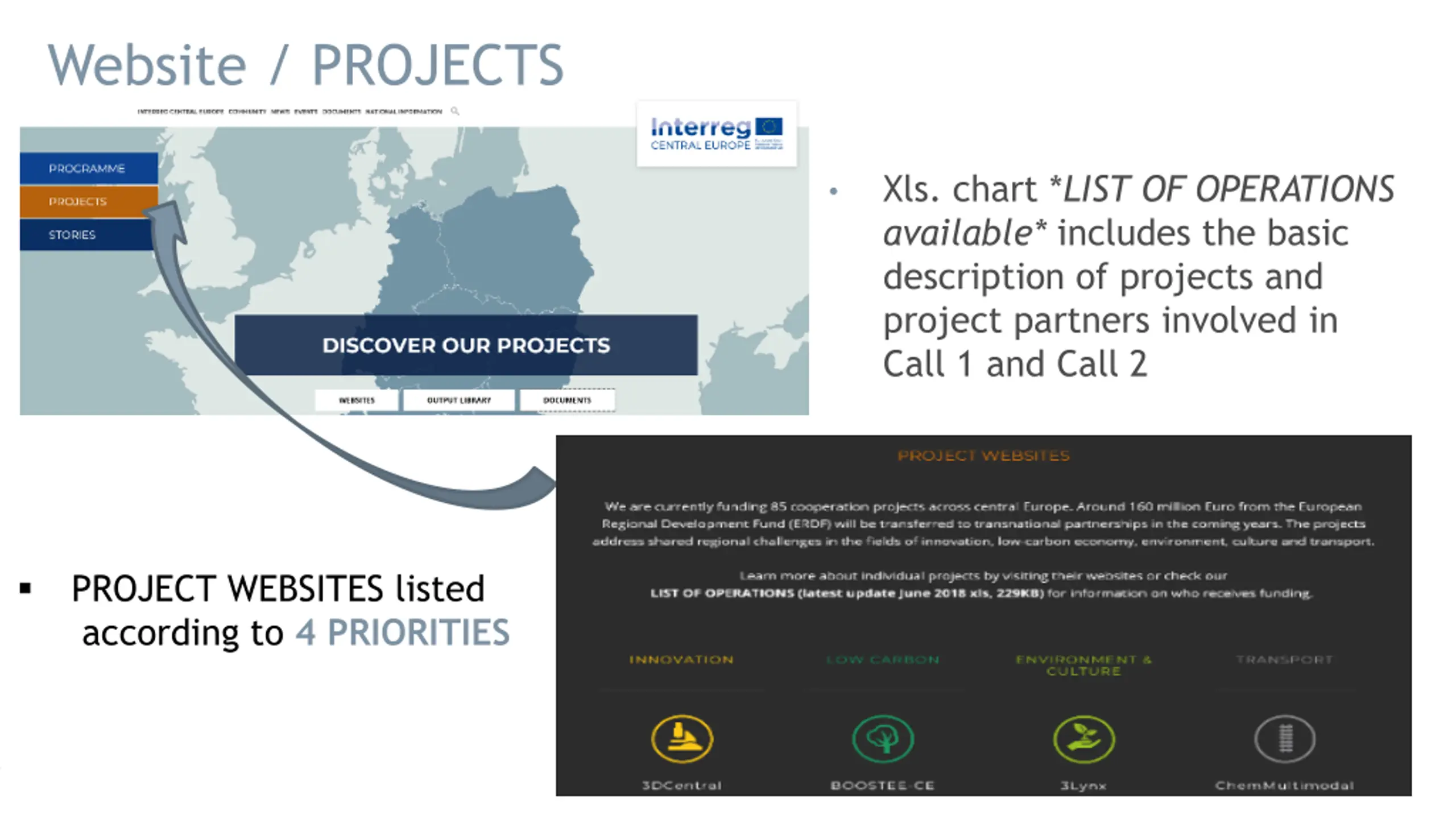 Website / PROJECTS Xls. chart *LIST OF OPERATIONS available* includes the basic description of projects and project partners involved in Call 1 and Call 2 PROJECT WEBSITES listed according to 4 PRIORITIES TAKING COOPERATION FORWARD