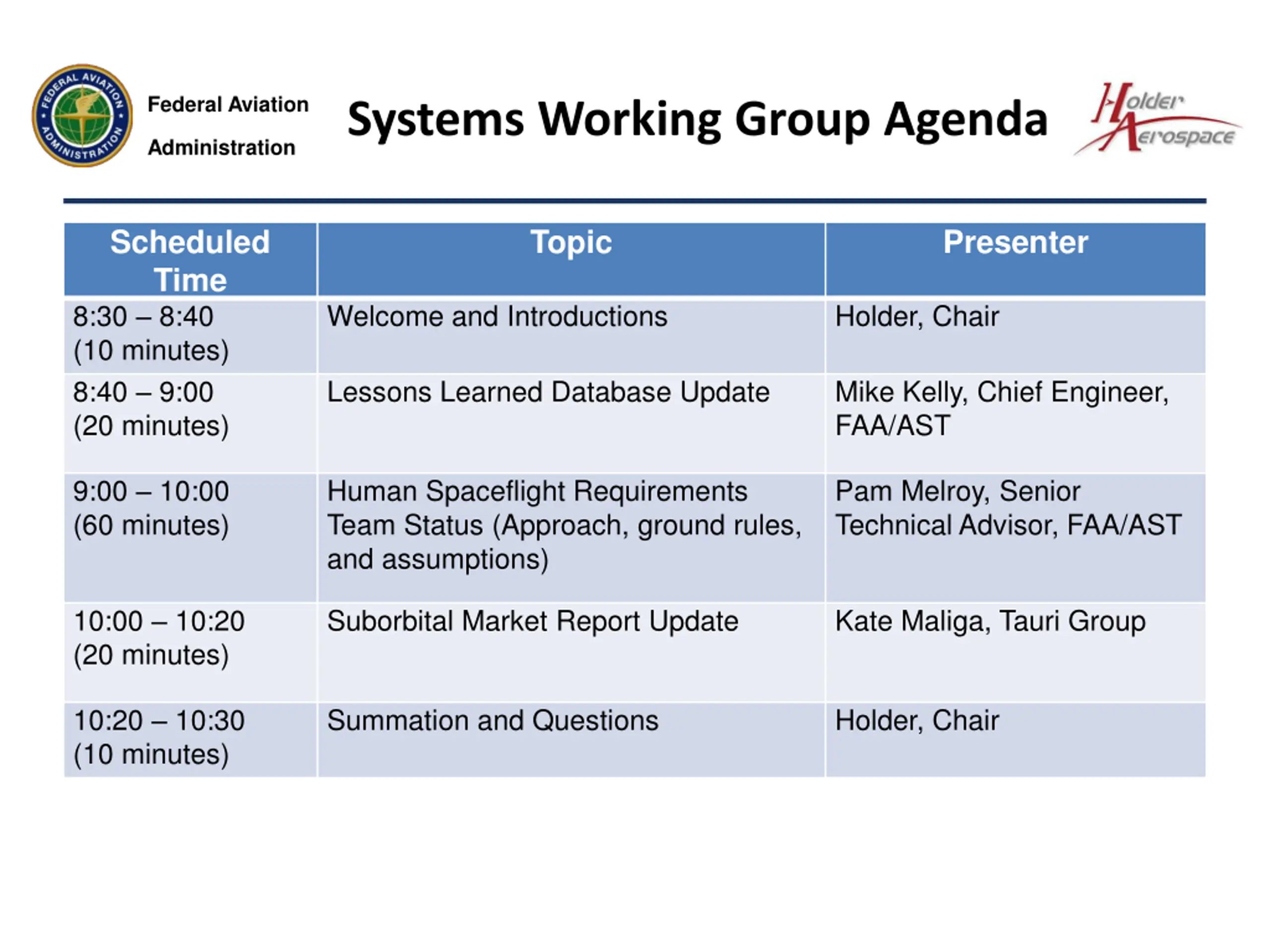 Federal Aviation Systems Working Group Agenda Administration Scheduled Time 8:30 8:40 (10 minutes) 8:40 9:00 (20 minutes) Topic Presenter Welcome and Introductions Holder, Chair Lessons Learned Database Update Mike Kelly, Chief Engineer, FAA/AST 9:00 10:00 (60 minutes) Human Spaceflight Requirements Team Status (Approach, ground rules, and assumptions) Pam Melroy, Senior Technical Advisor, FAA/AST 10:00 10:20 (20 minutes) Suborbital Market Report Update Kate Maliga, Tauri Group 10:20 10:30 (10 minutes) Summation and Questions Holder, Chair