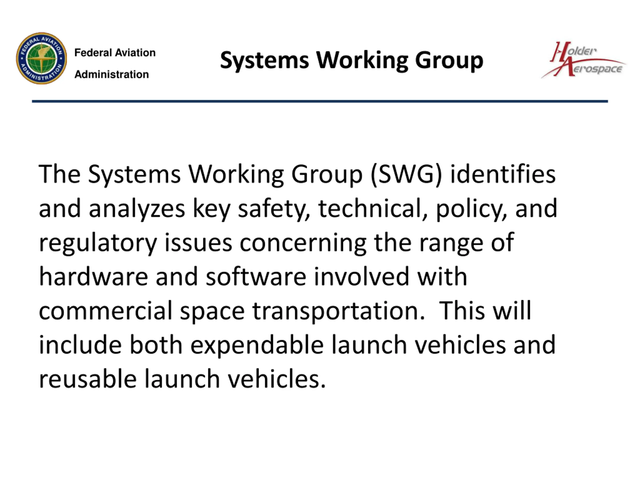 Federal Aviation Systems Working Group Administration The Systems Working Group (SWG) identifies and analyzes key safety, technical, policy, and regulatory issues concerning the range of hardware and software involved with commercial space transportation. This will include both expendable launch vehicles and reusable launch vehicles.