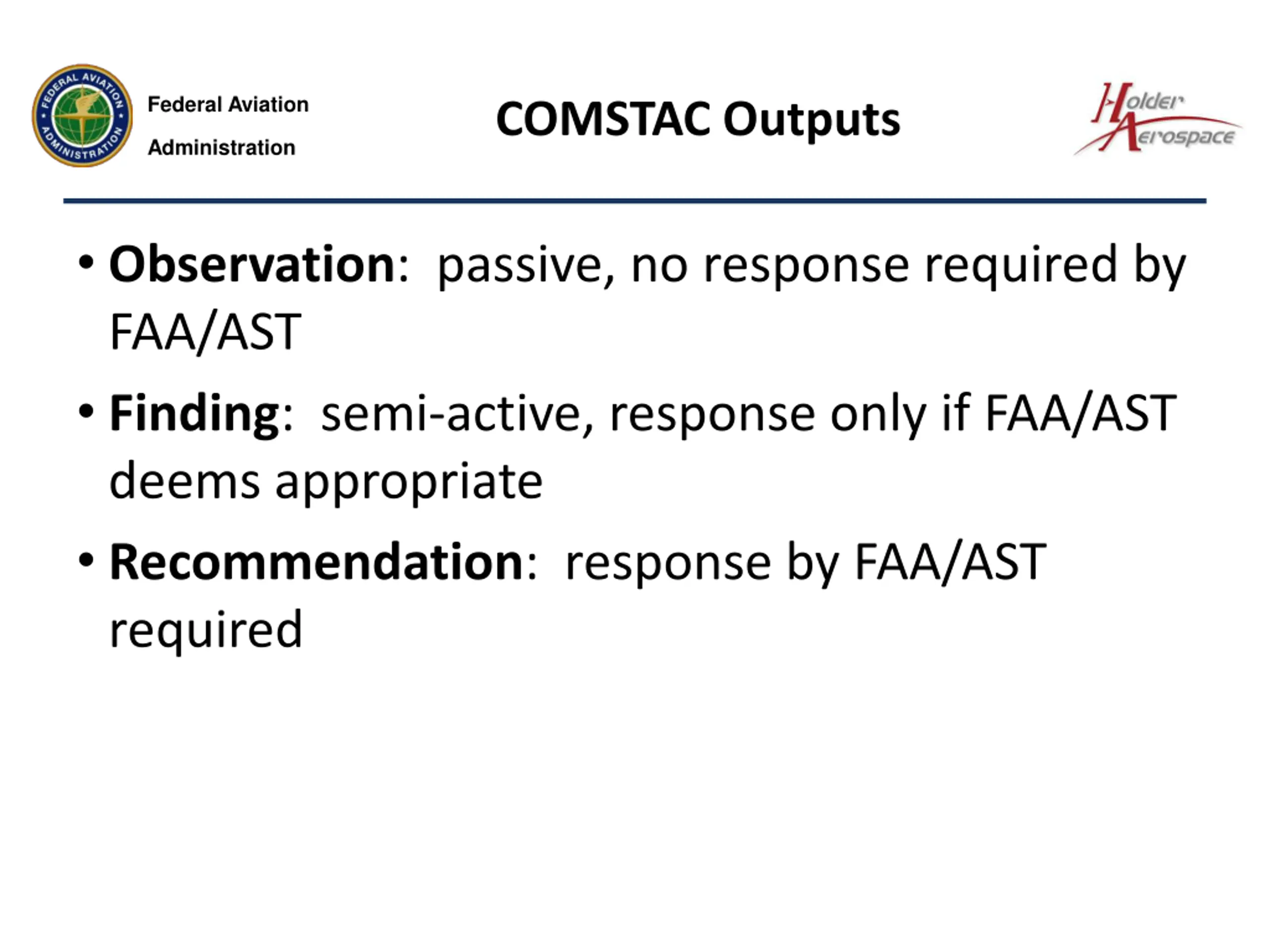 Federal Aviation COMSTAC Outputs Administration Observation: passive, no response required by FAA/AST Finding: semi-active, response only if FAA/AST deems appropriate Recommendation: response by FAA/AST required