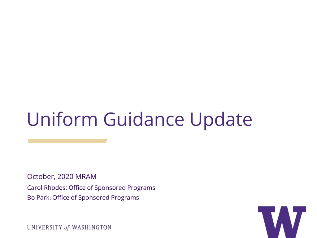 Uniform Guidance Update October, 2020 MRAM Carol Rhodes: Office of Sponsored Programs Bo Park: Office of Sponsored Programs