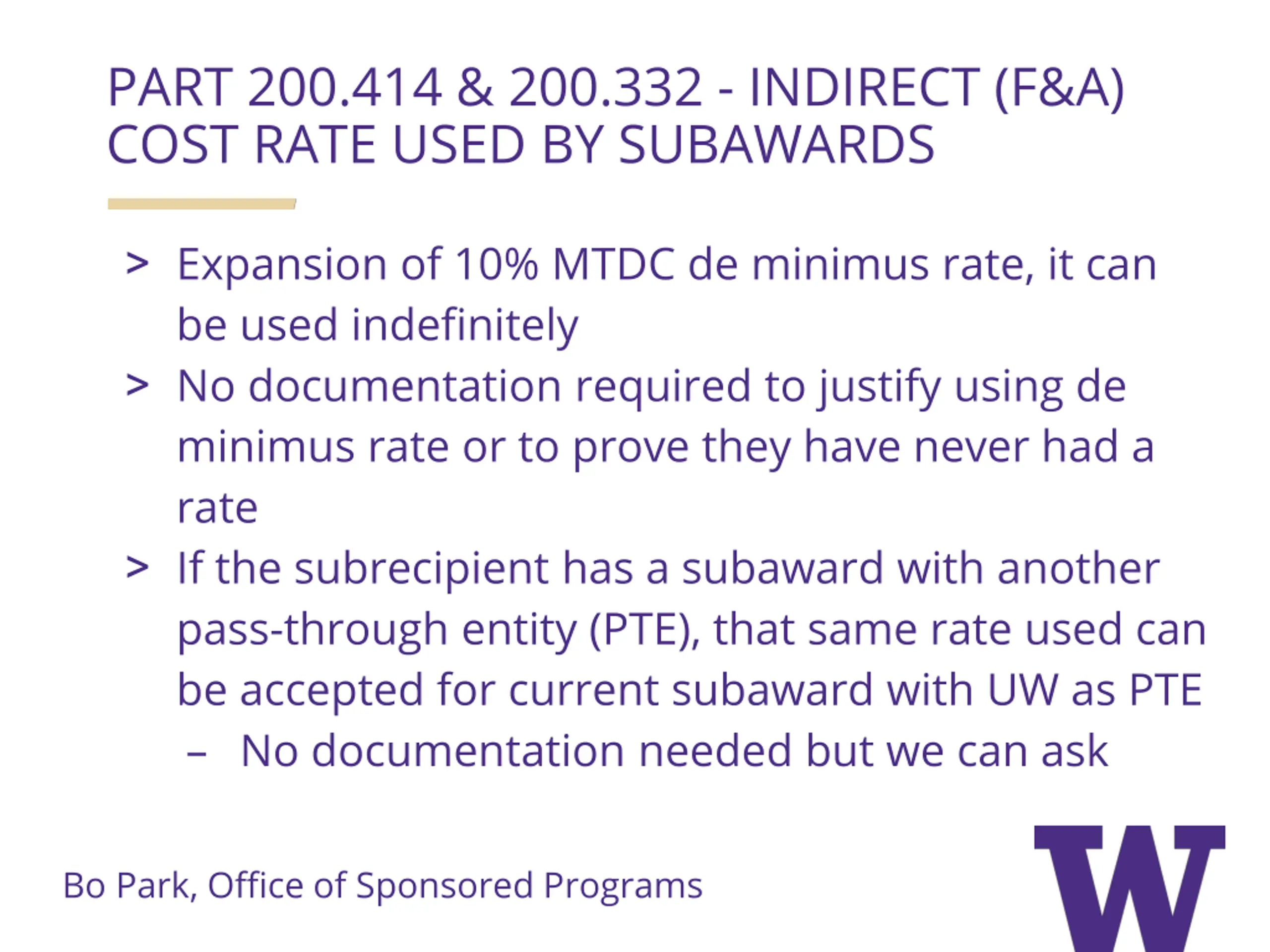 PART 200.414 & 200.332 - INDIRECT (F&A) COST RATE USED BY SUBAWARDS > Expansion of 10% MTDC de minimus rate, it can be used indefinitely > No documentation required to justify using de minimus rate or to prove they have never had a rate > If the subrecipient has a subaward with another pass-through entity (PTE), that same rate used can be accepted for current subaward with UW as PTE No documentation needed but we can ask Bo Park, Office of Sponsored Programs
