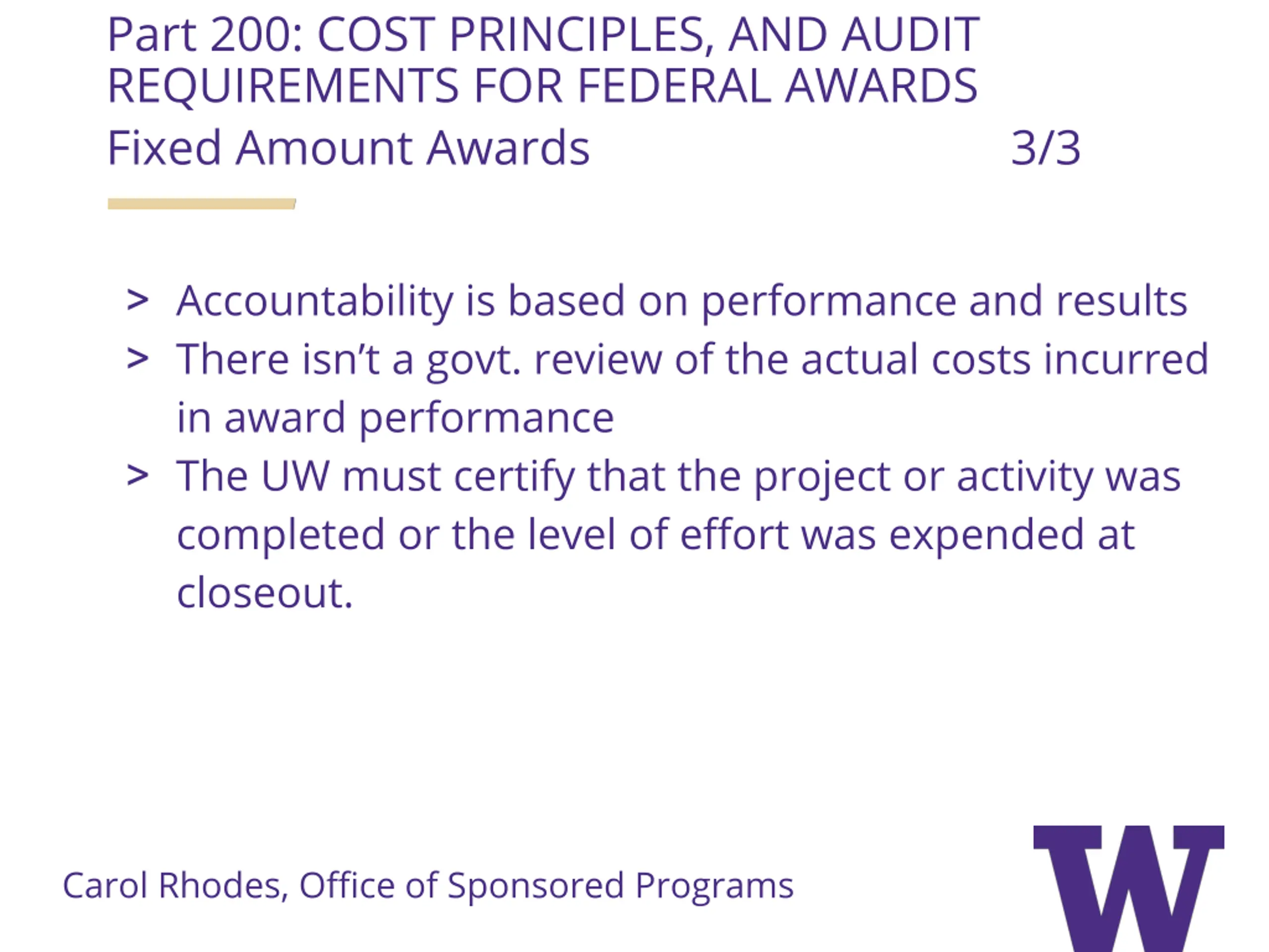 Part 200: COST PRINCIPLES, AND AUDIT REQUIREMENTS FOR FEDERAL AWARDS Fixed Amount Awards 3/3 > Accountability is based on performance and results > There isn t a govt. review of the actual costs incurred in award performance > The UW must certify that the project or activity was completed or the level of effort was expended at closeout. Carol Rhodes, Office of Sponsored Programs