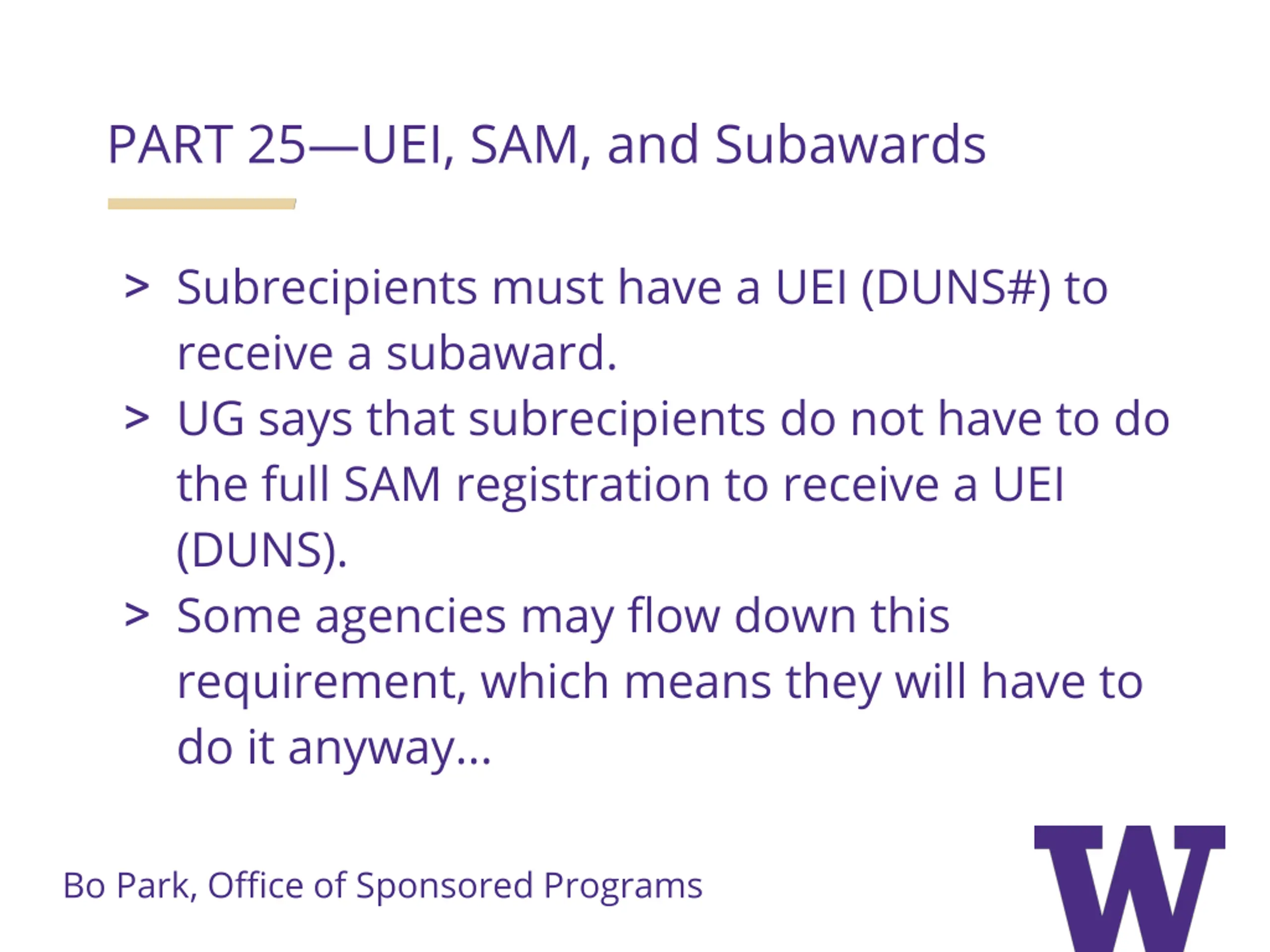 PART 25UEI, SAM, and Subawards > Subrecipients must have a UEI (DUNS#) to receive a subaward. > UG says that subrecipients do not have to do the full SAM registration to receive a UEI (DUNS). > Some agencies may flow down this requirement, which means they will have to do it anyway... Bo Park, Office of Sponsored Programs