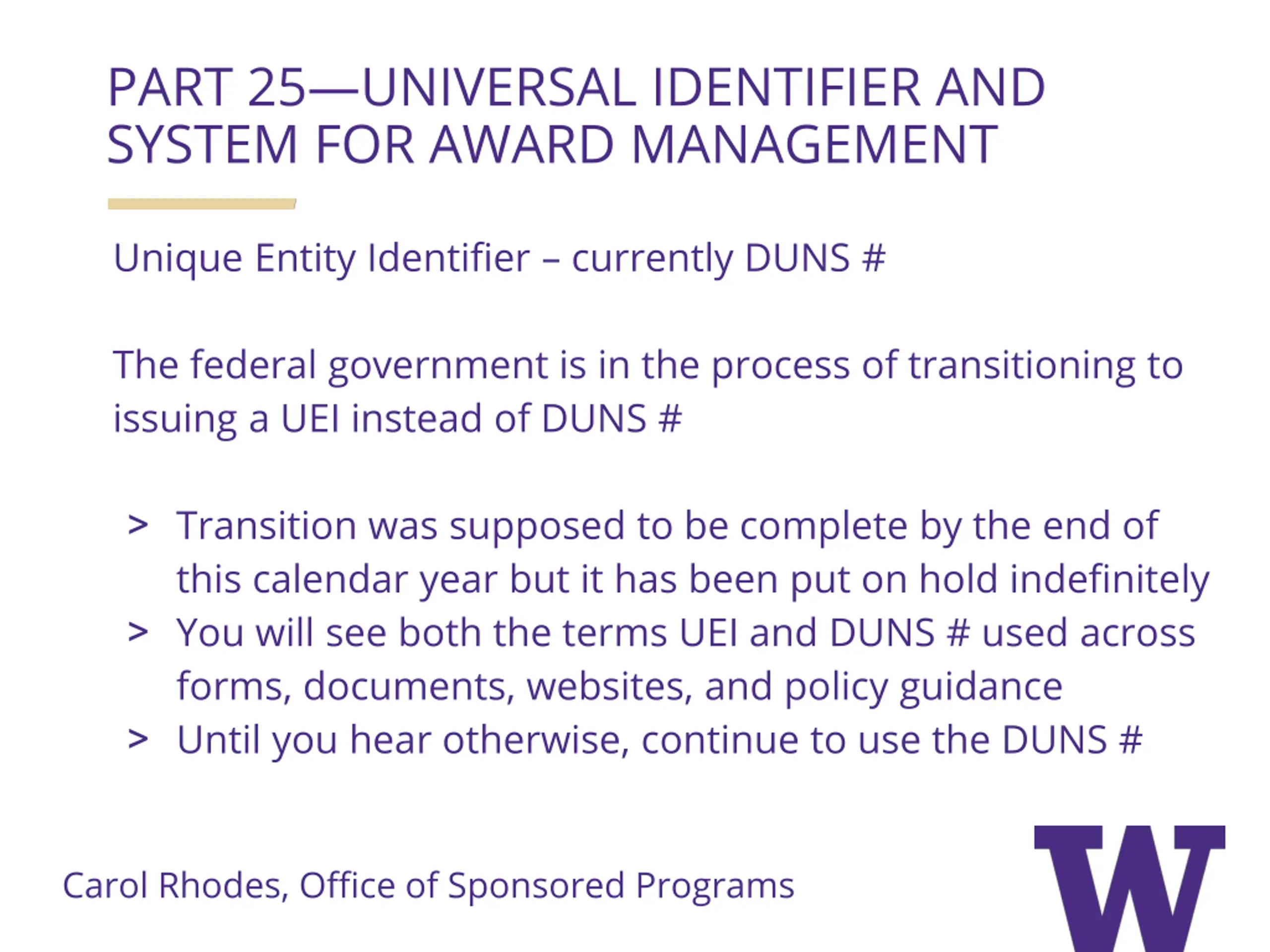 PART 25UNIVERSAL IDENTIFIER AND SYSTEM FOR AWARD MANAGEMENT Unique Entity Identifier currently DUNS # The federal government is in the process of transitioning to issuing a UEI instead of DUNS # > Transition was supposed to be complete by the end of this calendar year but it has been put on hold indefinitely > You will see both the terms UEI and DUNS # used across forms, documents, websites, and policy guidance > Until you hear otherwise, continue to use the DUNS # Carol Rhodes, Office of Sponsored Programs