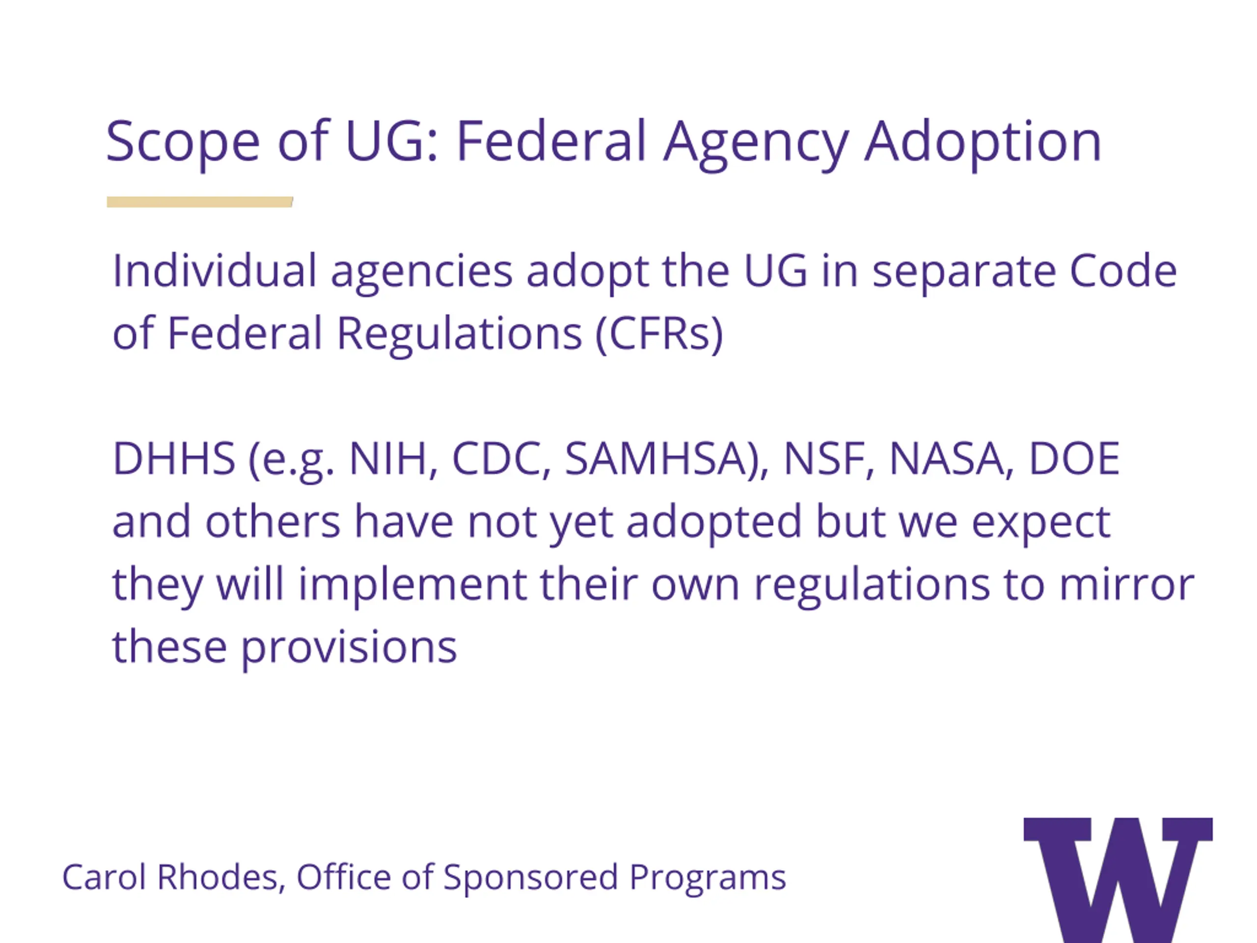 Scope of UG: Federal Agency Adoption Individual agencies adopt the UG in separate Code of Federal Regulations (CFRs) DHHS (e.g. NIH, CDC, SAMHSA), NSF, NASA, DOE and others have not yet adopted but we expect they will implement their own regulations to mirror these provisions Carol Rhodes, Office of Sponsored Programs