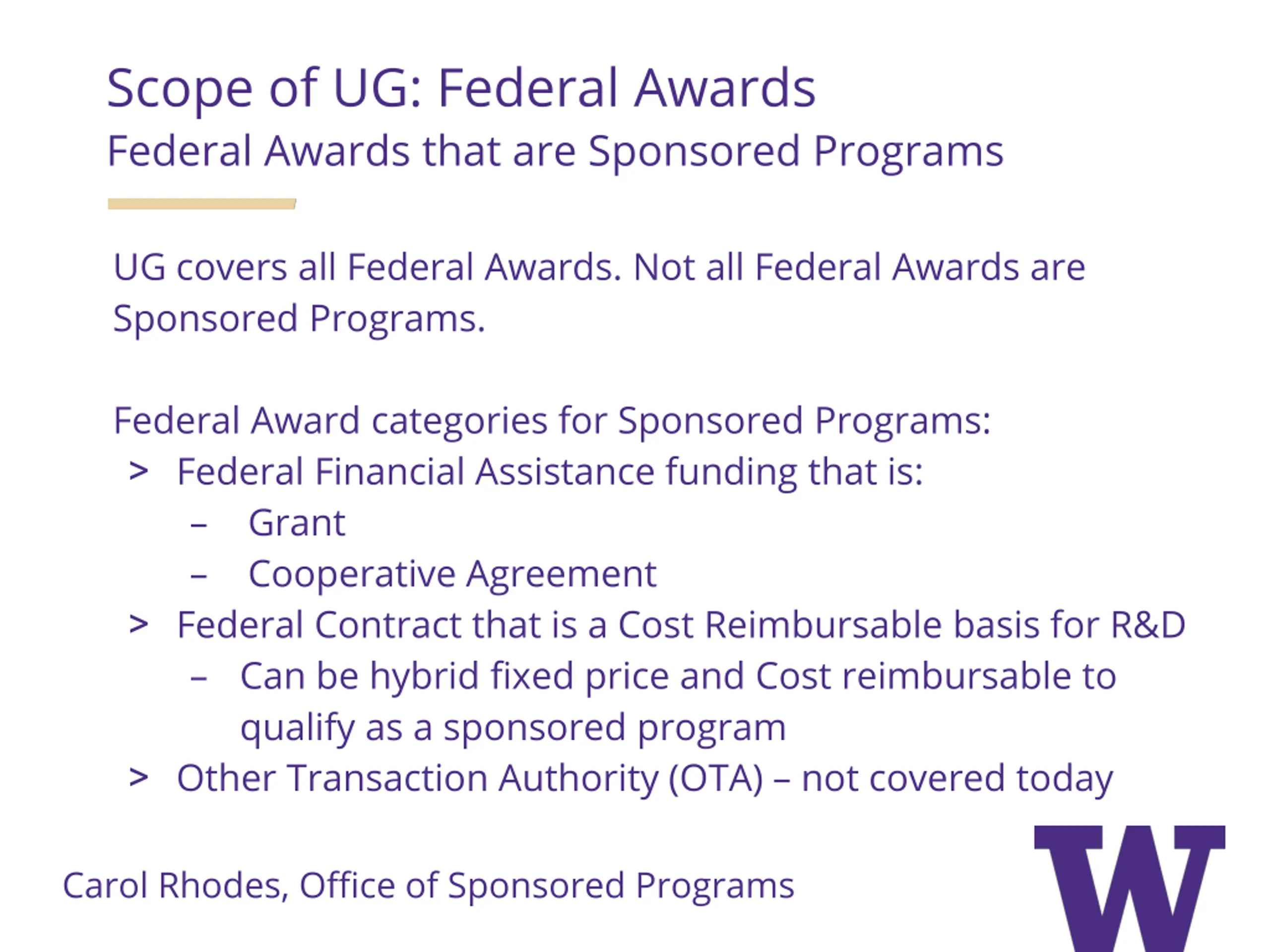 Scope of UG: Federal Awards Federal Awards that are Sponsored Programs UG covers all Federal Awards. Not all Federal Awards are Sponsored Programs. Federal Award categories for Sponsored Programs: > Federal Financial Assistance funding that is: Grant Cooperative Agreement > Federal Contract that is a Cost Reimbursable basis for R&D Can be hybrid fixed price and Cost reimbursable to qualify as a sponsored program > Other Transaction Authority (OTA) not covered today Carol Rhodes, Office of Sponsored Programs