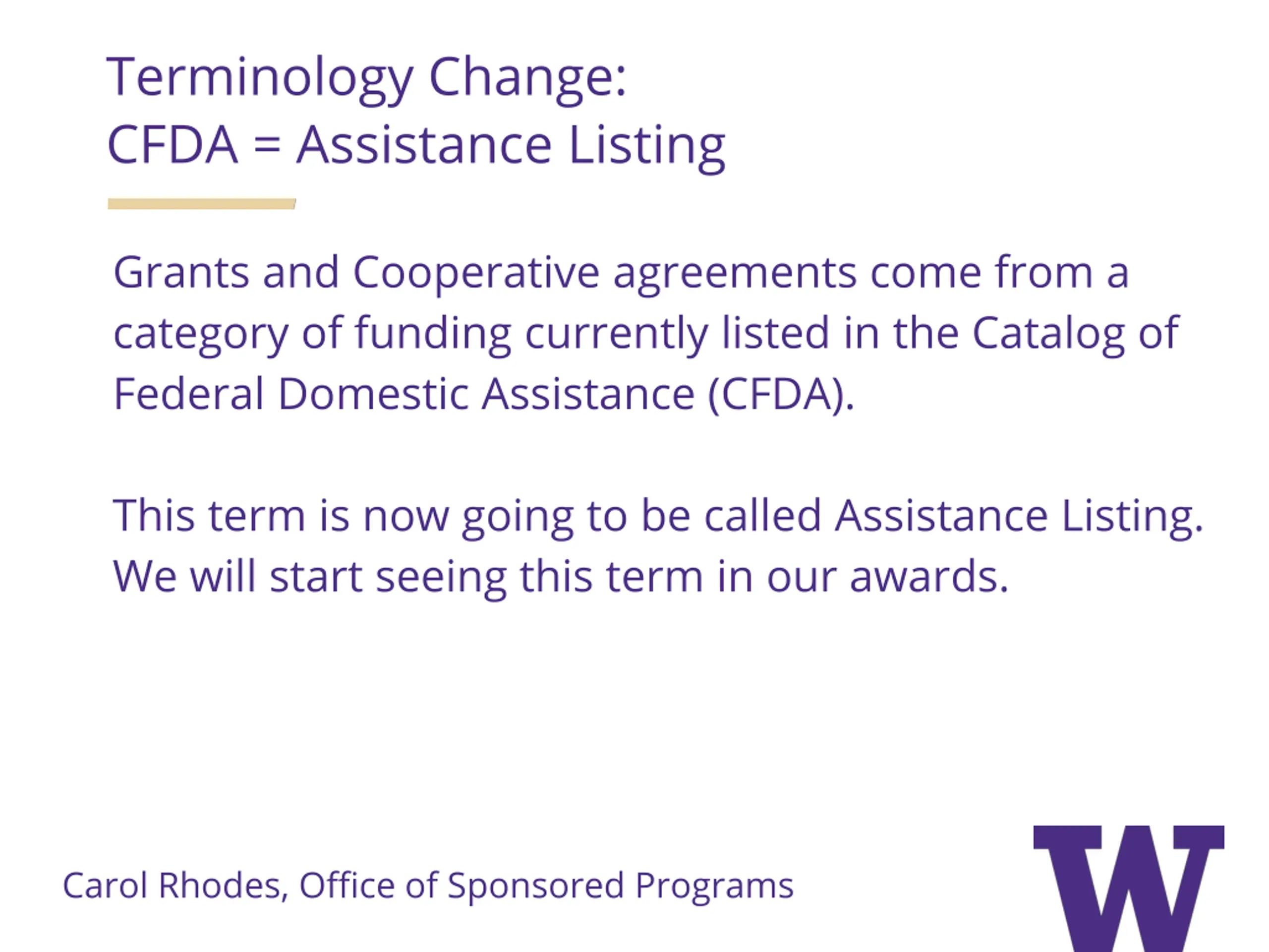 Terminology Change: CFDA = Assistance Listing Grants and Cooperative agreements come from a category of funding currently listed in the Catalog of Federal Domestic Assistance (CFDA). This term is now going to be called Assistance Listing. We will start seeing this term in our awards. Carol Rhodes, Office of Sponsored Programs