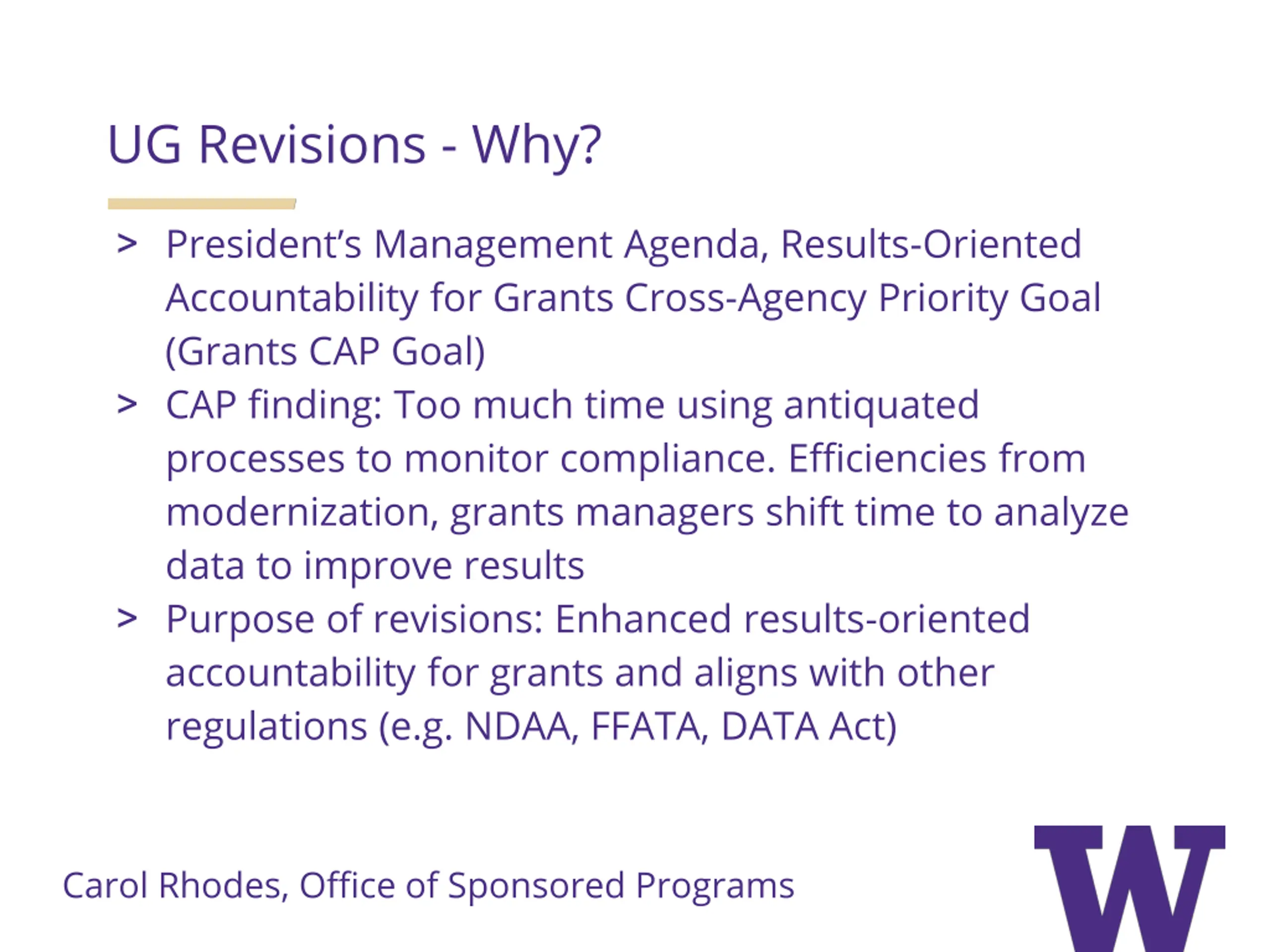 UG Revisions - Why? > President s Management Agenda, Results-Oriented Accountability for Grants Cross-Agency Priority Goal (Grants CAP Goal) > CAP finding: Too much time using antiquated processes to monitor compliance. Efficiencies from modernization, grants managers shift time to analyze data to improve results > Purpose of revisions: Enhanced results-oriented accountability for grants and aligns with other regulations (e.g. NDAA, FFATA, DATA Act) Carol Rhodes, Office of Sponsored Programs