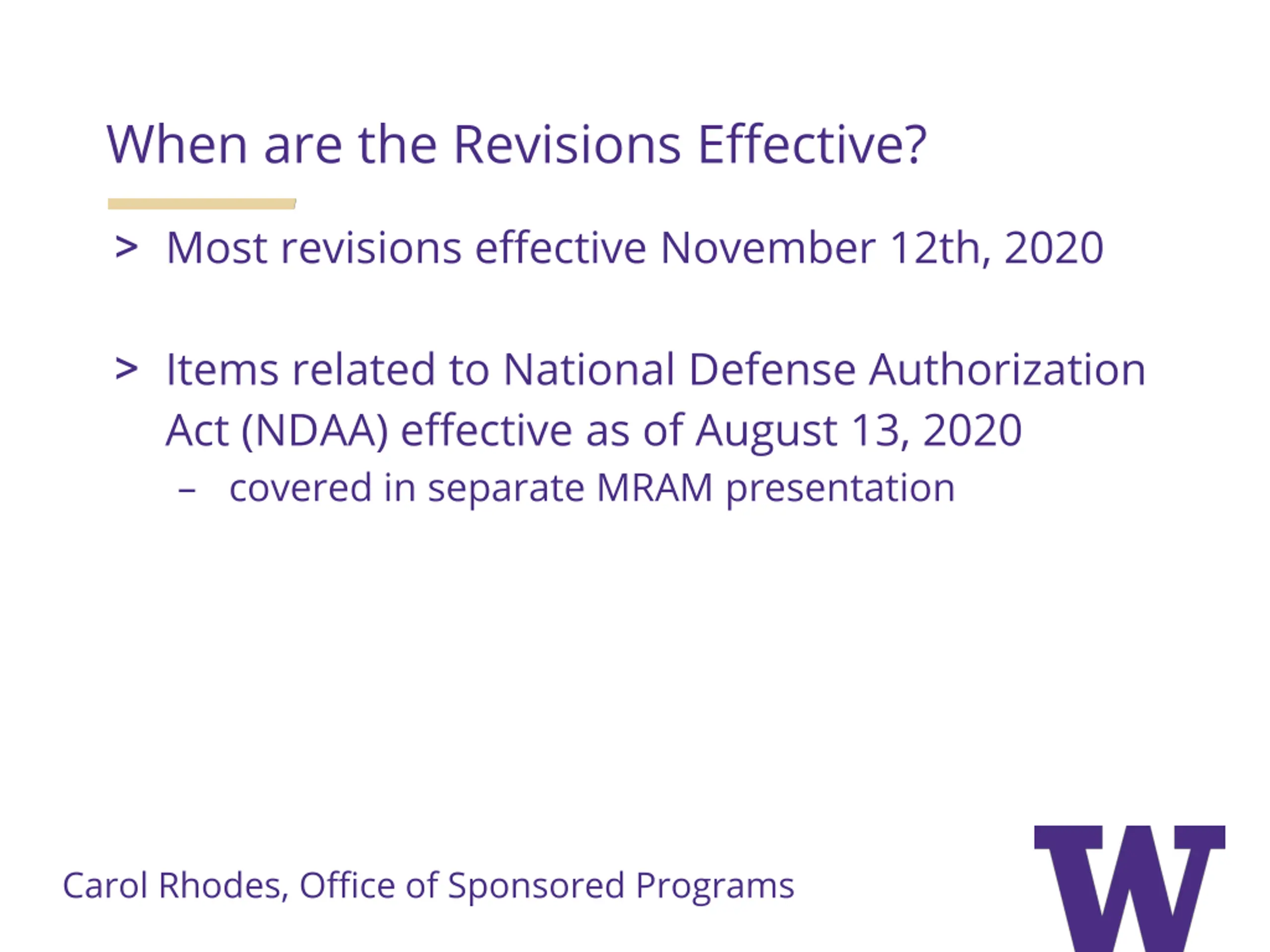 When are the Revisions Effective? > Most revisions effective November 12th, 2020 > Items related to National Defense Authorization Act (NDAA) effective as of August 13, 2020 covered in separate MRAM presentation Carol Rhodes, Office of Sponsored Programs