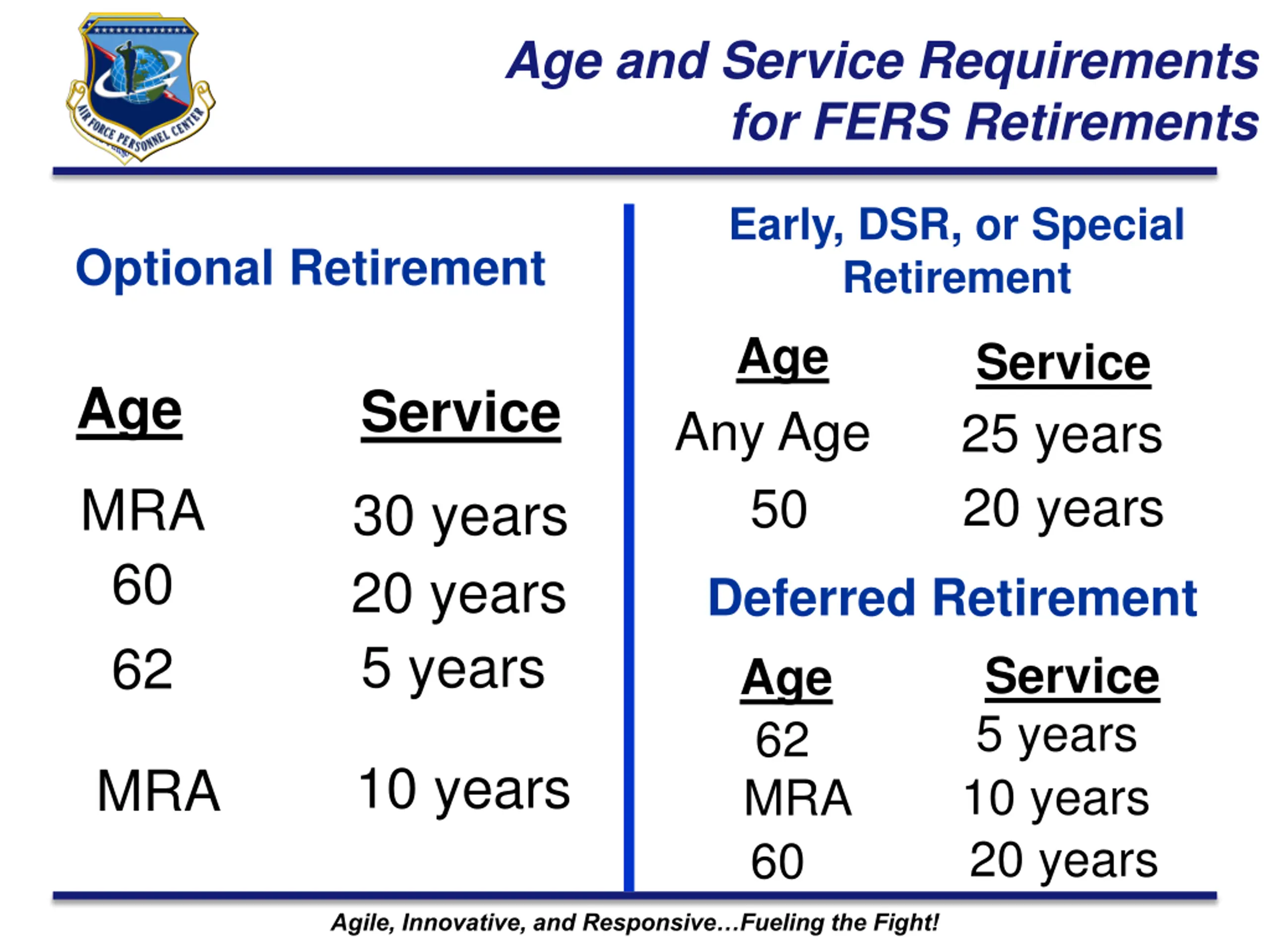 Age and Service Requirements for FERS Retirements Early, DSR, or Special Retirement Age Any Age 50 Optional Retirement Service 25 years 20 years Age Service MRA 60 62 30 years 20 years 5 years Deferred Retirement Age 62 MRA 60 Service 5 years 10 years 20 years 10 years MRA Agile, Innovative, and Responsive Fueling the Fight!