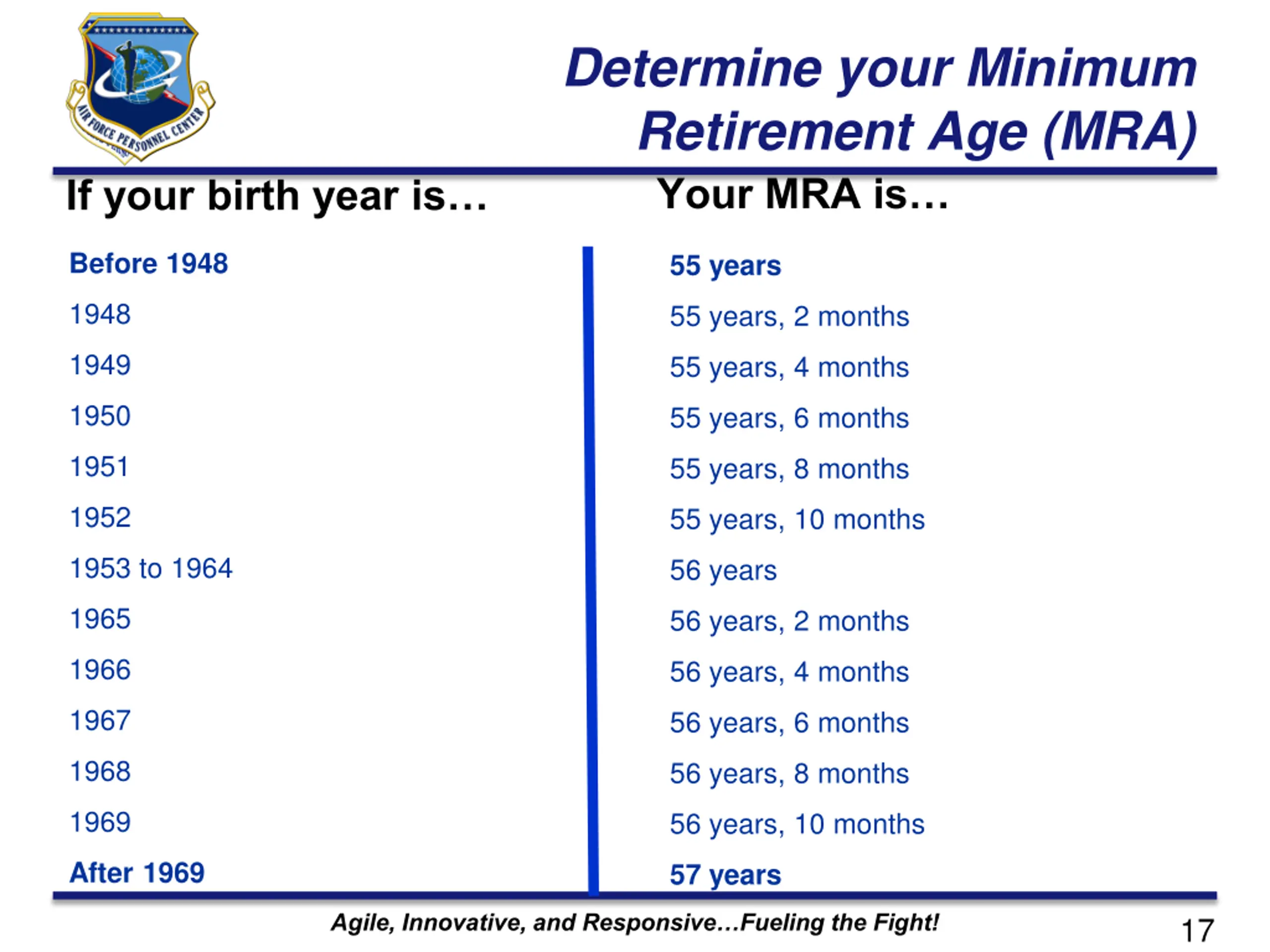 Determine your Minimum Retirement Age (MRA) Your MRA is If your birth year is Before 1948 55 years 1948 55 years, 2 months 1949 55 years, 4 months 1950 55 years, 6 months 1951 55 years, 8 months 1952 55 years, 10 months 1953 to 1964 56 years 1965 56 years, 2 months 1966 56 years, 4 months 1967 56 years, 6 months 1968 56 years, 8 months 1969 56 years, 10 months After 1969 57 years Agile, Innovative, and Responsive Fueling the Fight! 17
