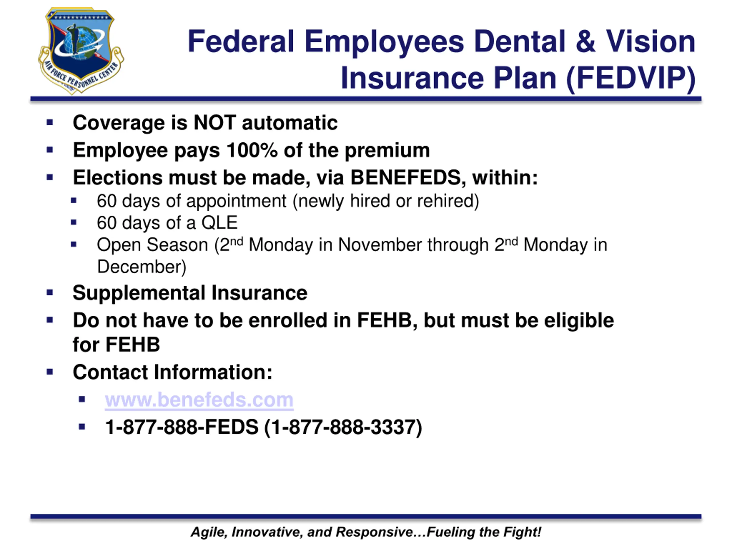 Federal Employees Dental & Vision Insurance Plan (FEDVIP) Coverage is NOT automatic Employee pays 100% of the premium Elections must be made, via BENEFEDS, within: 60 days of appointment (newly hired or rehired) 60 days of a QLE Open Season (2nd Monday in November through 2nd Monday in December) Supplemental Insurance Do not have to be enrolled in FEHB, but must be eligible for FEHB Contact Information: www.benefeds.com 1-877-888-FEDS (1-877-888-3337) Agile, Innovative, and Responsive Fueling the Fight!