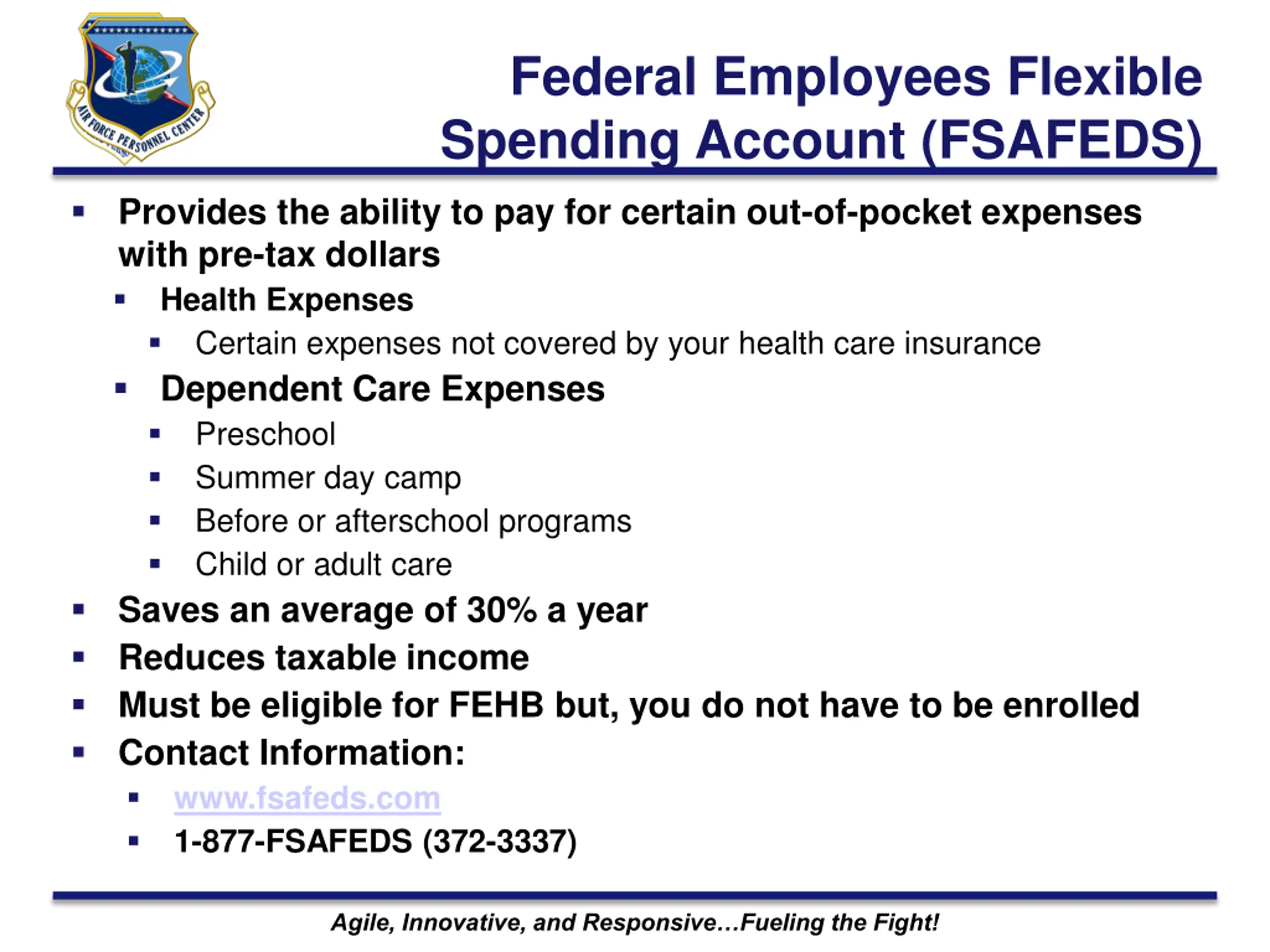 Federal Employees Flexible Spending Account (FSAFEDS) Provides the ability to pay for certain out-of-pocket expenses with pre-tax dollars Health Expenses Certain expenses not covered by your health care insurance Dependent Care Expenses Preschool Summer day camp Before or afterschool programs Child or adult care Saves an average of 30% a year Reduces taxable income Must be eligible for FEHB but, you do not have to be enrolled Contact Information: www.fsafeds.com 1-877-FSAFEDS (372-3337) Agile, Innovative, and Responsive Fueling the Fight!