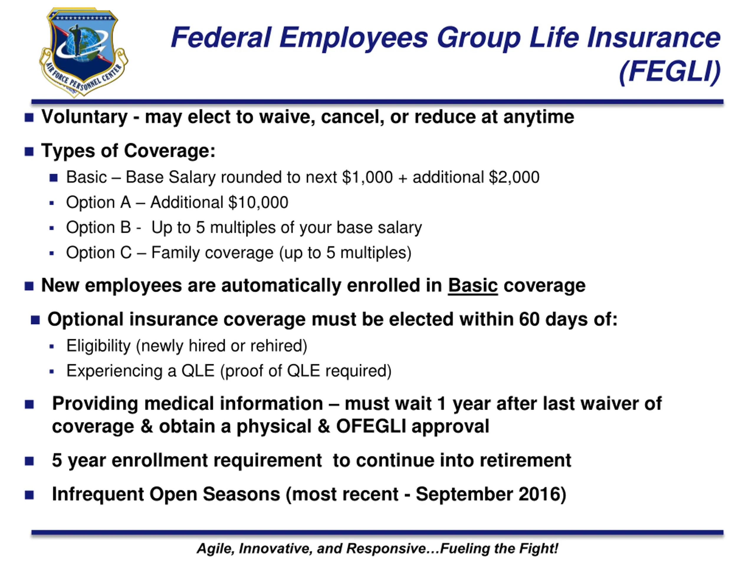 Federal Employees Group Life Insurance (FEGLI) Voluntary - may elect to waive, cancel, or reduce at anytime Types of Coverage: Basic Base Salary rounded to next $1,000 + additional $2,000 Option A Additional $10,000 Option B - Up to 5 multiples of your base salary Option C Family coverage (up to 5 multiples) New employees are automatically enrolled in Basic coverage Optional insurance coverage must be elected within 60 days of: Eligibility (newly hired or rehired) Experiencing a QLE (proof of QLE required) Providing medical information must wait 1 year after last waiver of coverage & obtain a physical & OFEGLI approval 5 year enrollment requirement to continue into retirement Infrequent Open Seasons (most recent - September 2016) Agile, Innovative, and Responsive Fueling the Fight!