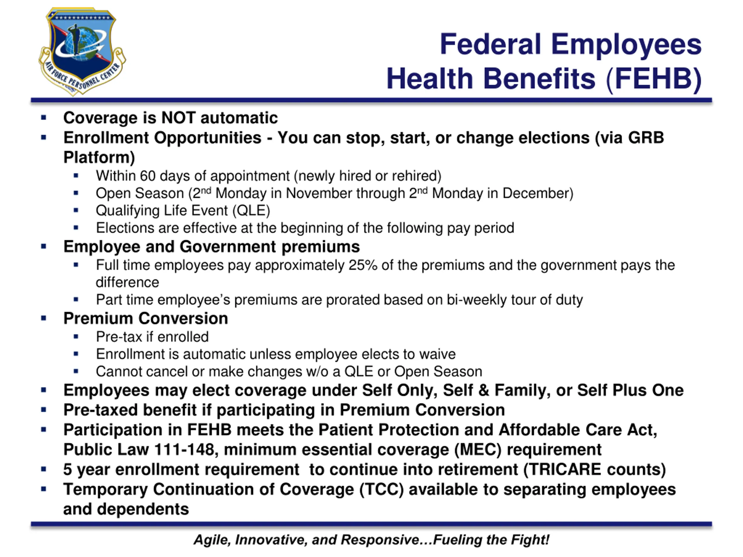 Federal Employees Health Benefits (FEHB) Coverage is NOT automatic Enrollment Opportunities - You can stop, start, or change elections (via GRB Platform) Within 60 days of appointment (newly hired or rehired) Open Season (2nd Monday in November through 2nd Monday in December) Qualifying Life Event (QLE) Elections are effective at the beginning of the following pay period Employee and Government premiums Full time employees pay approximately 25% of the premiums and the government pays the difference Part time employee s premiums are prorated based on bi-weekly tour of duty Premium Conversion Pre-tax if enrolled Enrollment is automatic unless employee elects to waive Cannot cancel or make changes w/o a QLE or Open Season Employees may elect coverage under Self Only, Self & Family, or Self Plus One Pre-taxed benefit if participating in Premium Conversion Participation in FEHB meets the Patient Protection and Affordable Care Act, Public Law 111-148, minimum essential coverage (MEC) requirement 5 year enrollment requirement to continue into retirement (TRICARE counts) Temporary Continuation of Coverage (TCC) available to separating employees and dependents Agile, Innovative, and Responsive Fueling the Fight!