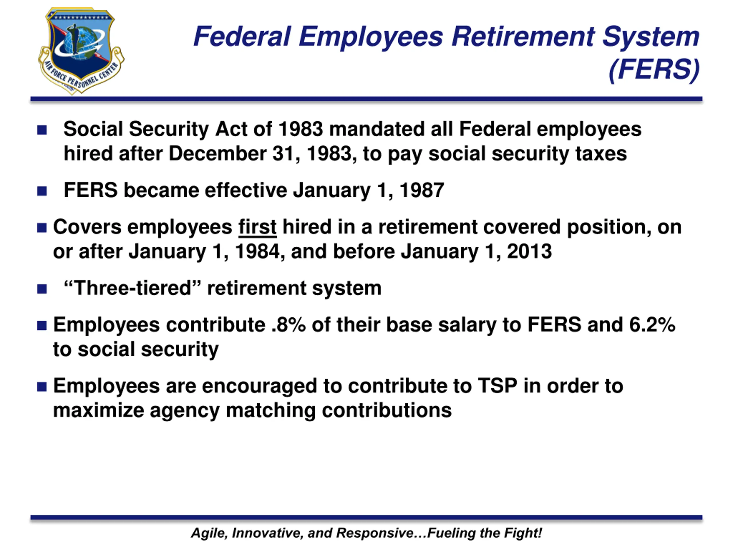 Federal Employees Retirement System (FERS) Social Security Act of 1983 mandated all Federal employees hired after December 31, 1983, to pay social security taxes FERS became effective January 1, 1987 Covers employees first hired in a retirement covered position, on or after January 1, 1984, and before January 1, 2013 Three-tiered retirement system Employees contribute .8% of their base salary to FERS and 6.2% to social security Employees are encouraged to contribute to TSP in order to maximize agency matching contributions Agile, Innovative, and Responsive Fueling the Fight!