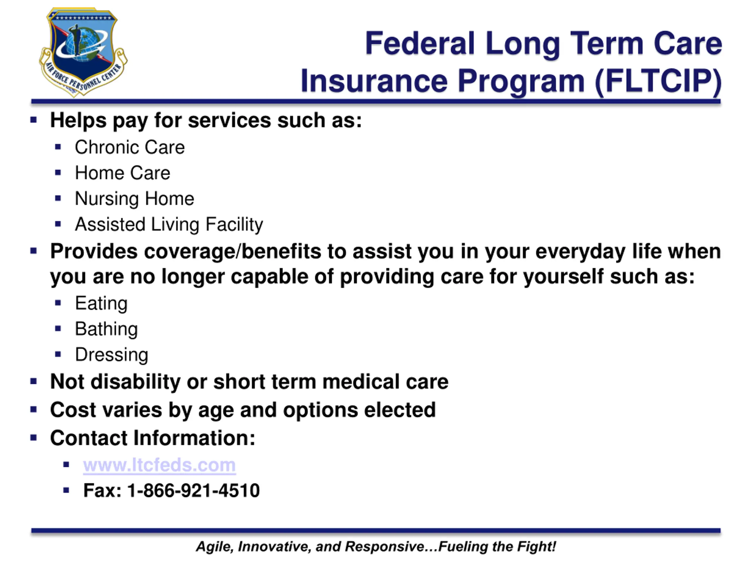 Federal Long Term Care Insurance Program (FLTCIP) Helps pay for services such as: Chronic Care Home Care Nursing Home Assisted Living Facility Provides coverage/benefits to assist you in your everyday life when you are no longer capable of providing care for yourself such as: Eating Bathing Dressing Not disability or short term medical care Cost varies by age and options elected Contact Information: www.ltcfeds.com Fax: 1-866-921-4510 Agile, Innovative, and Responsive Fueling the Fight!