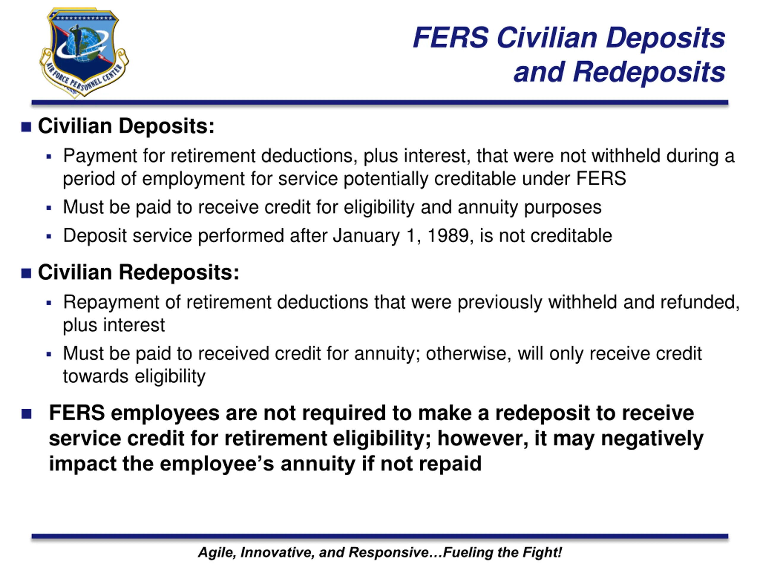 FERS Civilian Deposits and Redeposits Civilian Deposits: Payment for retirement deductions, plus interest, that were not withheld during a period of employment for service potentially creditable under FERS Must be paid to receive credit for eligibility and annuity purposes Deposit service performed after January 1, 1989, is not creditable Civilian Redeposits: Repayment of retirement deductions that were previously withheld and refunded, plus interest Must be paid to received credit for annuity; otherwise, will only receive credit towards eligibility FERS employees are not required to make a redeposit to receive service credit for retirement eligibility; however, it may negatively impact the employee s annuity if not repaid Agile, Innovative, and Responsive Fueling the Fight!
