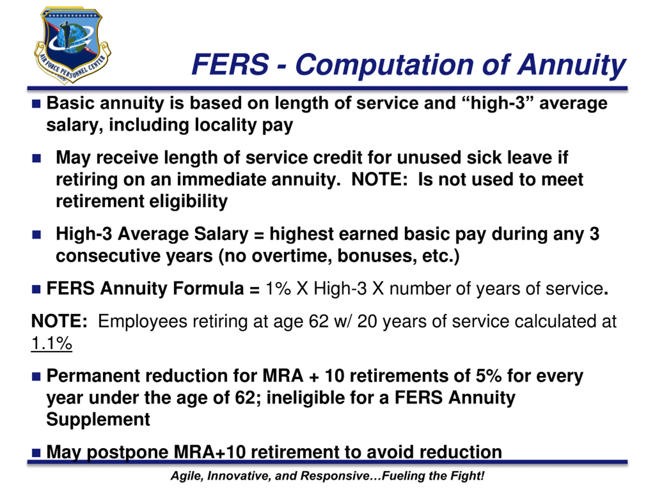 FERS - Computation of Annuity Basic annuity is based on length of service and high-3 average salary, including locality pay May receive length of service credit for unused sick leave if retiring on an immediate annuity. NOTE:Is not used to meet retirement eligibility High-3 Average Salary = highest earned basic pay during any 3 consecutive years (no overtime, bonuses, etc.) FERS Annuity Formula = 1% X High-3 X number of years of service. NOTE: Employees retiring at age 62 w/ 20 years of service calculated at 1.1% Permanent reduction for MRA + 10 retirements of 5% for every year under the age of 62; ineligible for a FERS Annuity Supplement May postpone MRA+10 retirement to avoid reduction Agile, Innovative, and Responsive Fueling the Fight!
