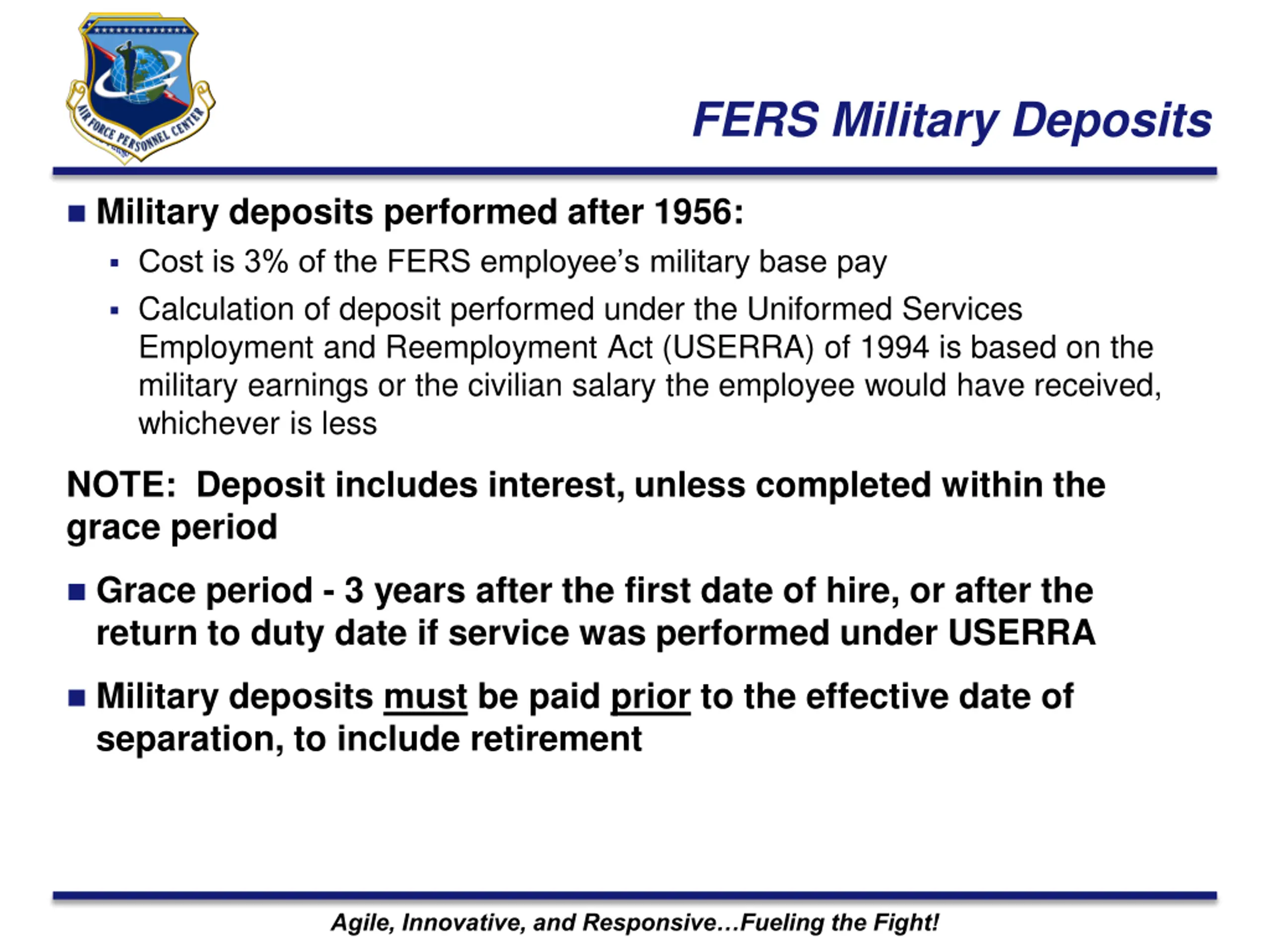 FERS Military Deposits Military deposits performed after 1956: Cost is 3% of the FERS employee s military base pay Calculation of deposit performed under the Uniformed Services Employment and Reemployment Act (USERRA) of 1994 is based on the military earnings or the civilian salary the employee would have received, whichever is less NOTE: Deposit includes interest, unless completed within the grace period Grace period - 3 years after the first date of hire, or after the return to duty date if service was performed under USERRA Military deposits must be paid prior to the effective date of separation, to include retirement Agile, Innovative, and Responsive Fueling the Fight!