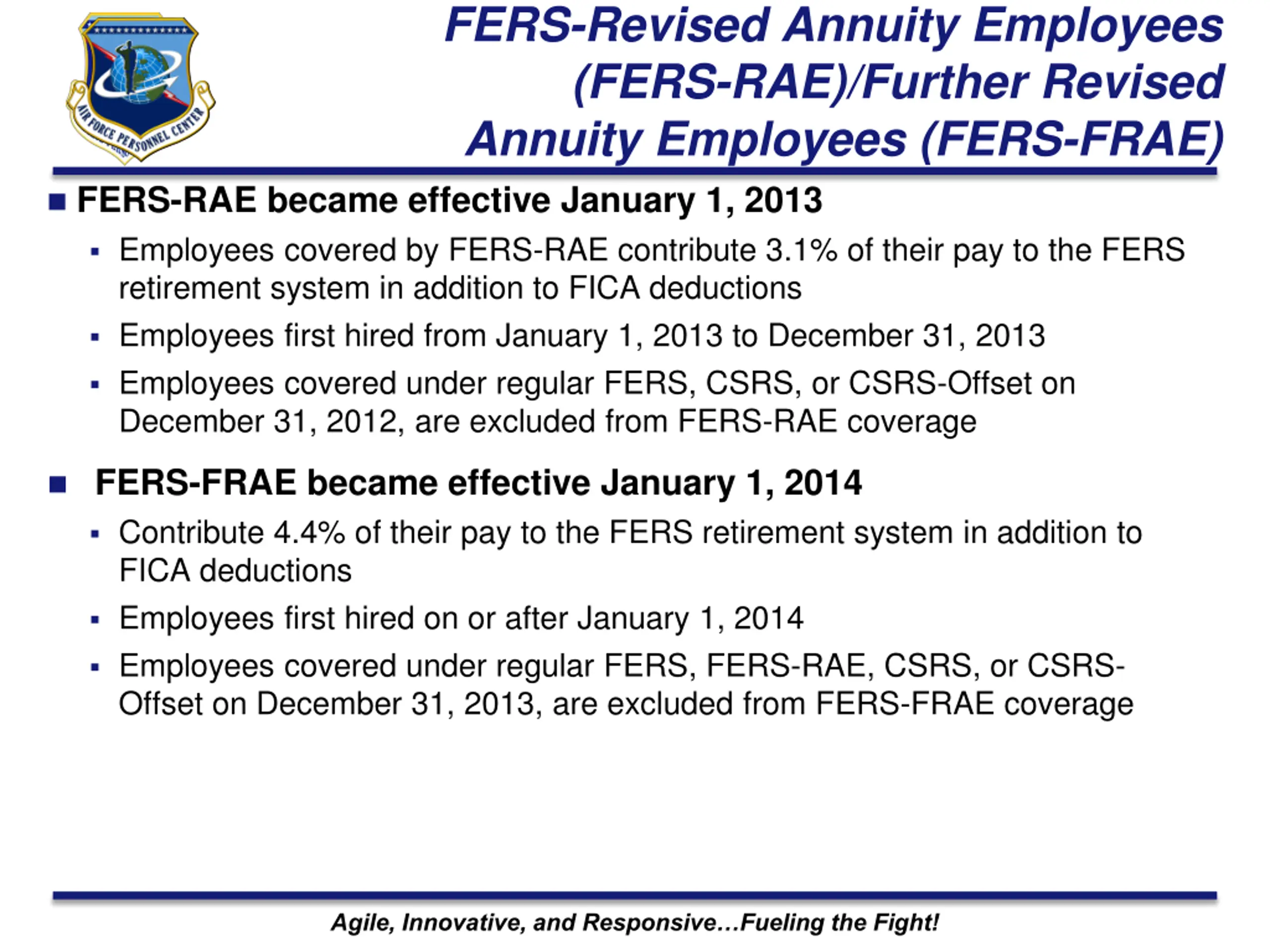 FERS-Revised Annuity Employees (FERS-RAE)/Further Revised Annuity Employees (FERS-FRAE) FERS-RAE became effective January 1, 2013 Employees covered by FERS-RAE contribute 3.1% of their pay to the FERS retirement system in addition to FICA deductions Employees first hired from January 1, 2013 to December 31, 2013 Employees covered under regular FERS, CSRS, or CSRS-Offset on December 31, 2012, are excluded from FERS-RAE coverage FERS-FRAE became effective January 1, 2014 Contribute 4.4% of their pay to the FERS retirement system in addition to FICA deductions Employees first hired on or after January 1, 2014 Employees covered under regular FERS, FERS-RAE, CSRS, or CSRS- Offset on December 31, 2013, are excluded from FERS-FRAE coverage Agile, Innovative, and Responsive Fueling the Fight!
