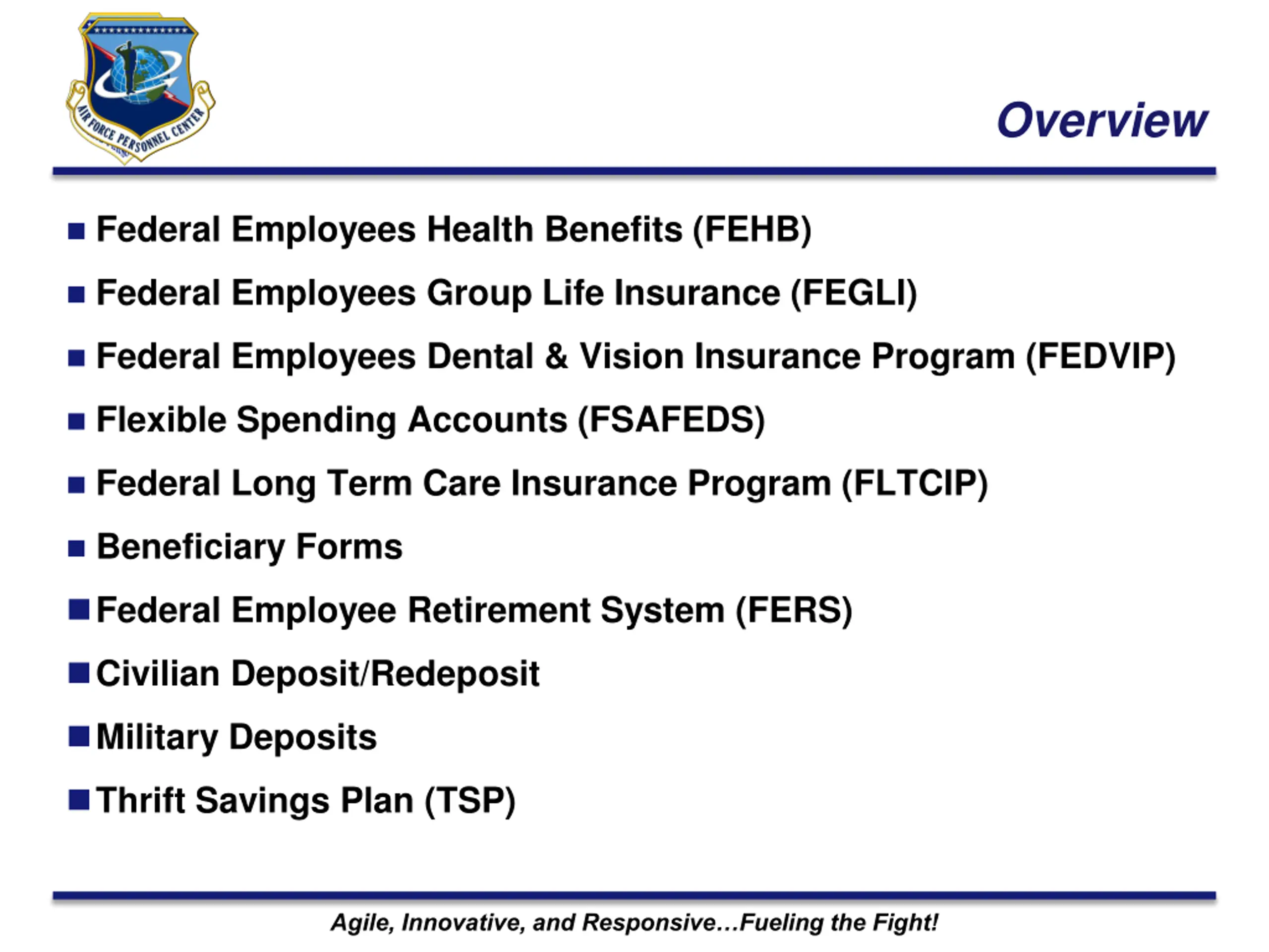 Overview Federal Employees Health Benefits (FEHB) Federal Employees Group Life Insurance (FEGLI) Federal Employees Dental & Vision Insurance Program (FEDVIP) Flexible Spending Accounts (FSAFEDS) Federal Long Term Care Insurance Program (FLTCIP) Beneficiary Forms Federal Employee Retirement System (FERS) Civilian Deposit/Redeposit Military Deposits Thrift Savings Plan (TSP) Agile, Innovative, and Responsive Fueling the Fight!