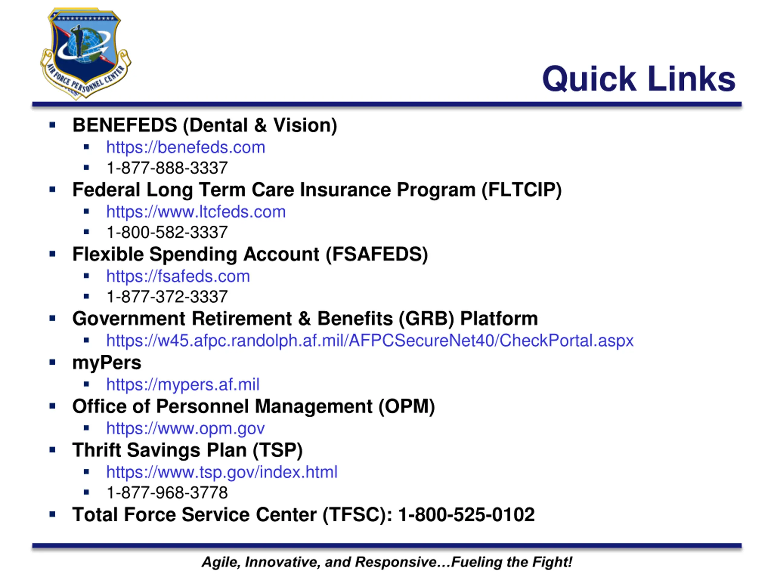 Quick Links BENEFEDS (Dental & Vision) https://benefeds.com 1-877-888-3337 Federal Long Term Care Insurance Program (FLTCIP) https://www.ltcfeds.com 1-800-582-3337 Flexible Spending Account (FSAFEDS) https://fsafeds.com 1-877-372-3337 Government Retirement & Benefits (GRB) Platform https://w45.afpc.randolph.af.mil/AFPCSecureNet40/CheckPortal.aspx myPers https://mypers.af.mil Office of Personnel Management (OPM) https://www.opm.gov Thrift Savings Plan (TSP) https://www.tsp.gov/index.html 1-877-968-3778 Total Force Service Center (TFSC): 1-800-525-0102 Agile, Innovative, and Responsive Fueling the Fight!