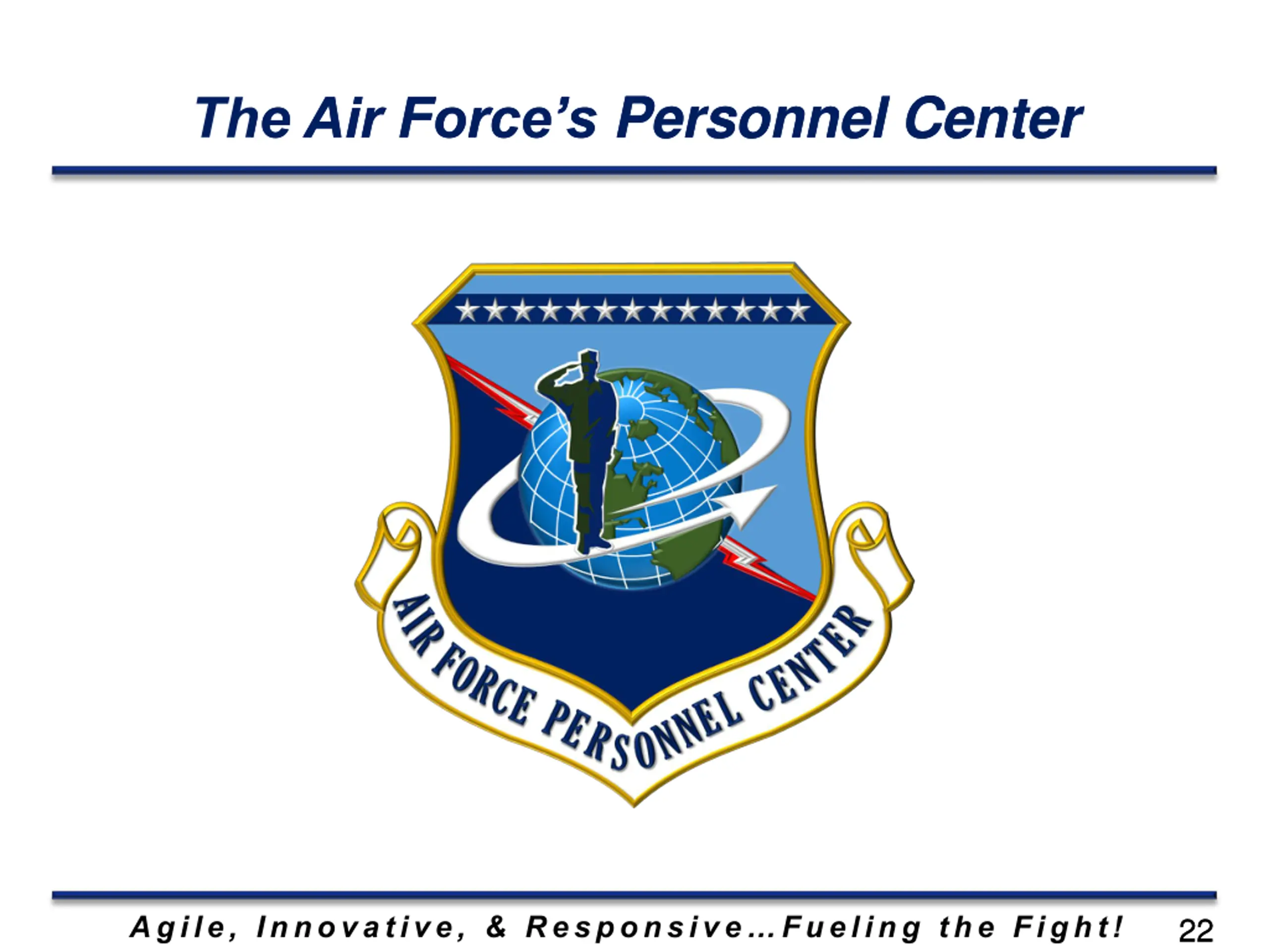 The Air Forces Personnel Center The Air Force s Personnel Center Agile, Innovative, & Responsive Fueling the Fight! 22 22