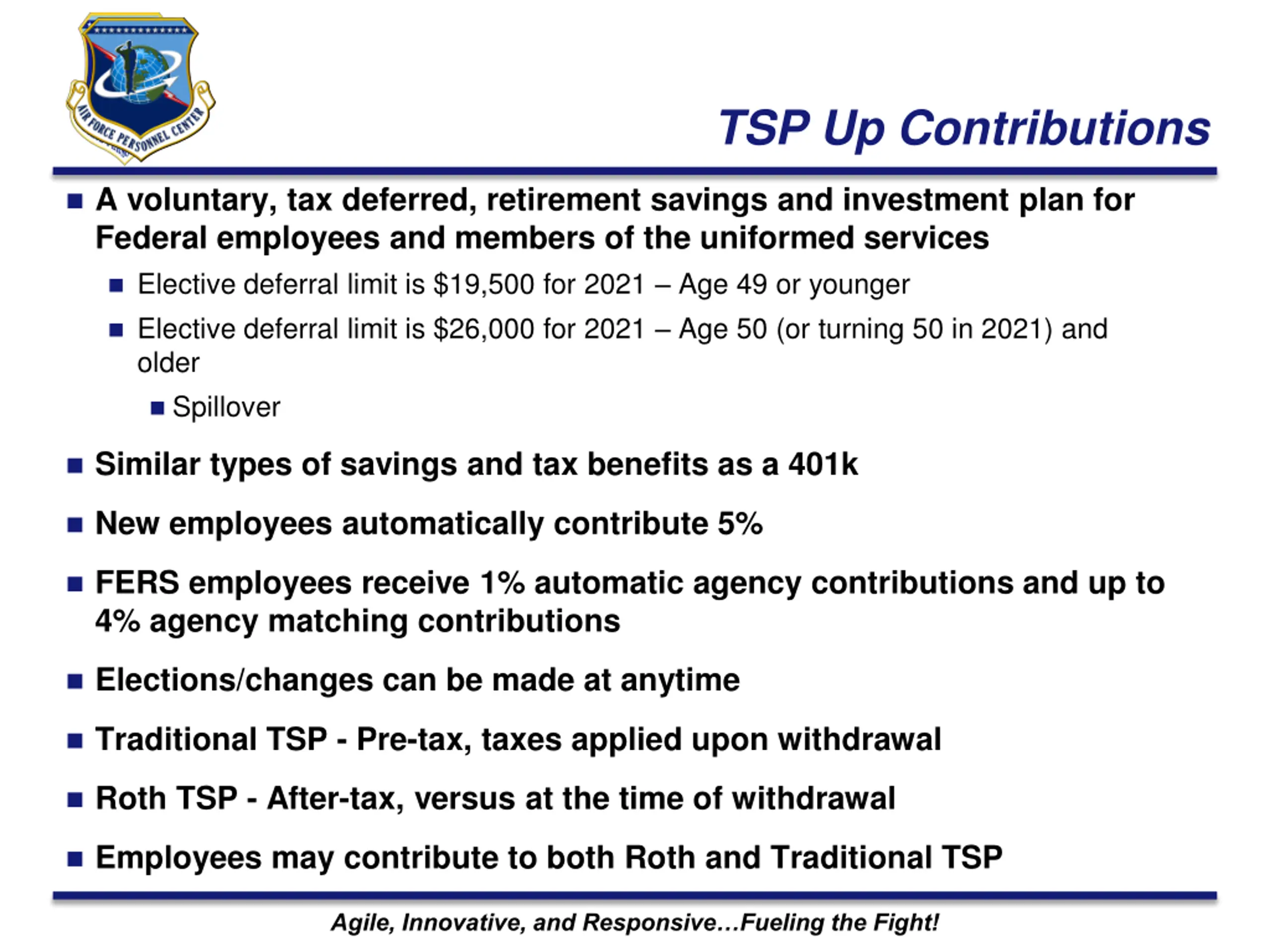TSP Up Contributions A voluntary, tax deferred, retirement savings and investment plan for Federal employees and members of the uniformed services Elective deferral limit is $19,500 for 2021 Age 49 or younger Elective deferral limit is $26,000 for 2021 Age 50 (or turning 50 in 2021) and older Spillover Similar types of savings and tax benefits as a 401k New employees automatically contribute 5% FERS employees receive 1% automatic agency contributions and up to 4% agency matching contributions Elections/changes can be made at anytime Traditional TSP - Pre-tax, taxes applied upon withdrawal Roth TSP - After-tax, versus at the time of withdrawal Employees may contribute to both Roth and Traditional TSP Agile, Innovative, and Responsive Fueling the Fight!