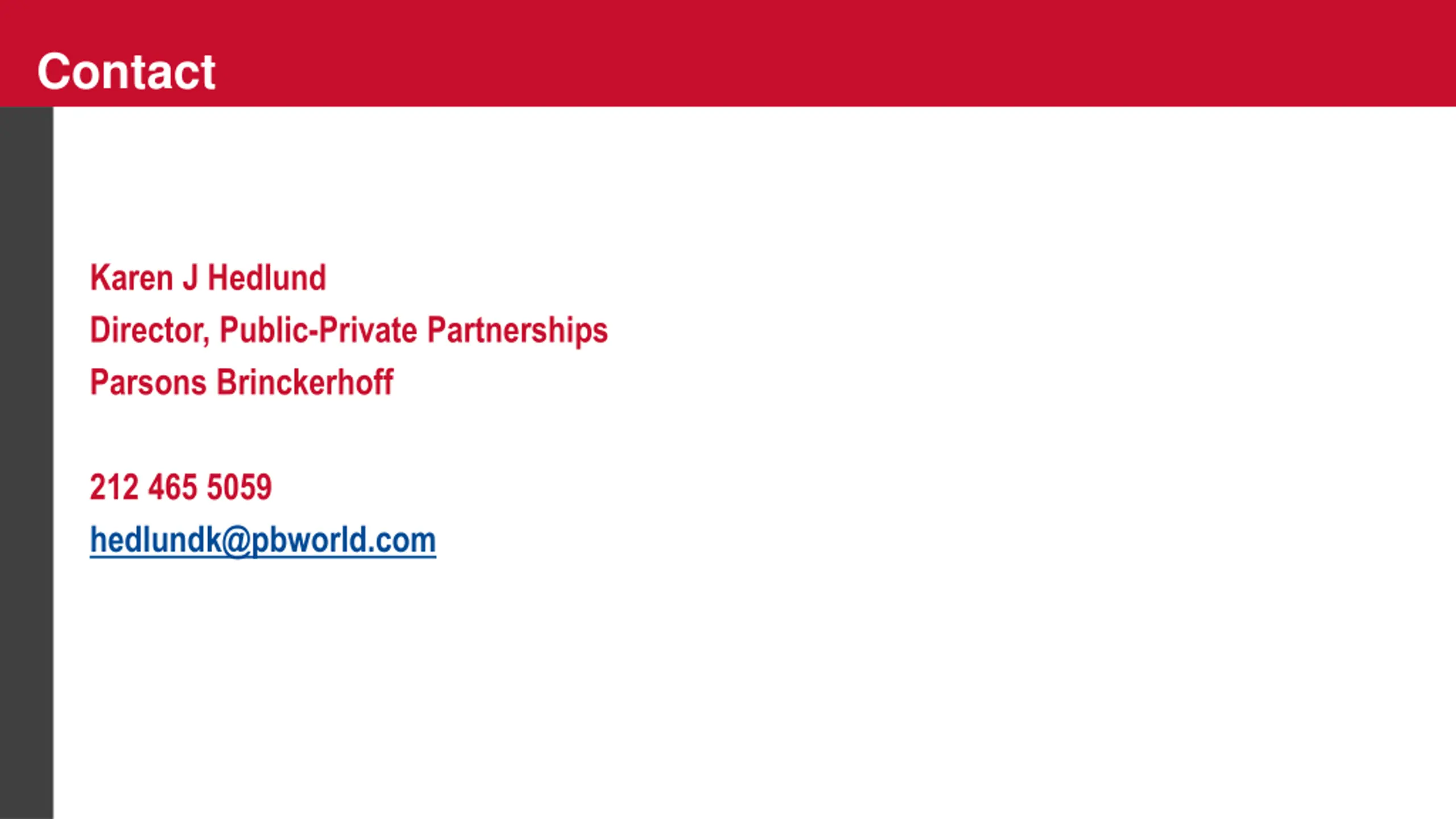 Contact Karen J Hedlund Director, Public-Private Partnerships Parsons Brinckerhoff 212 465 5059 hedlundk@pbworld.com