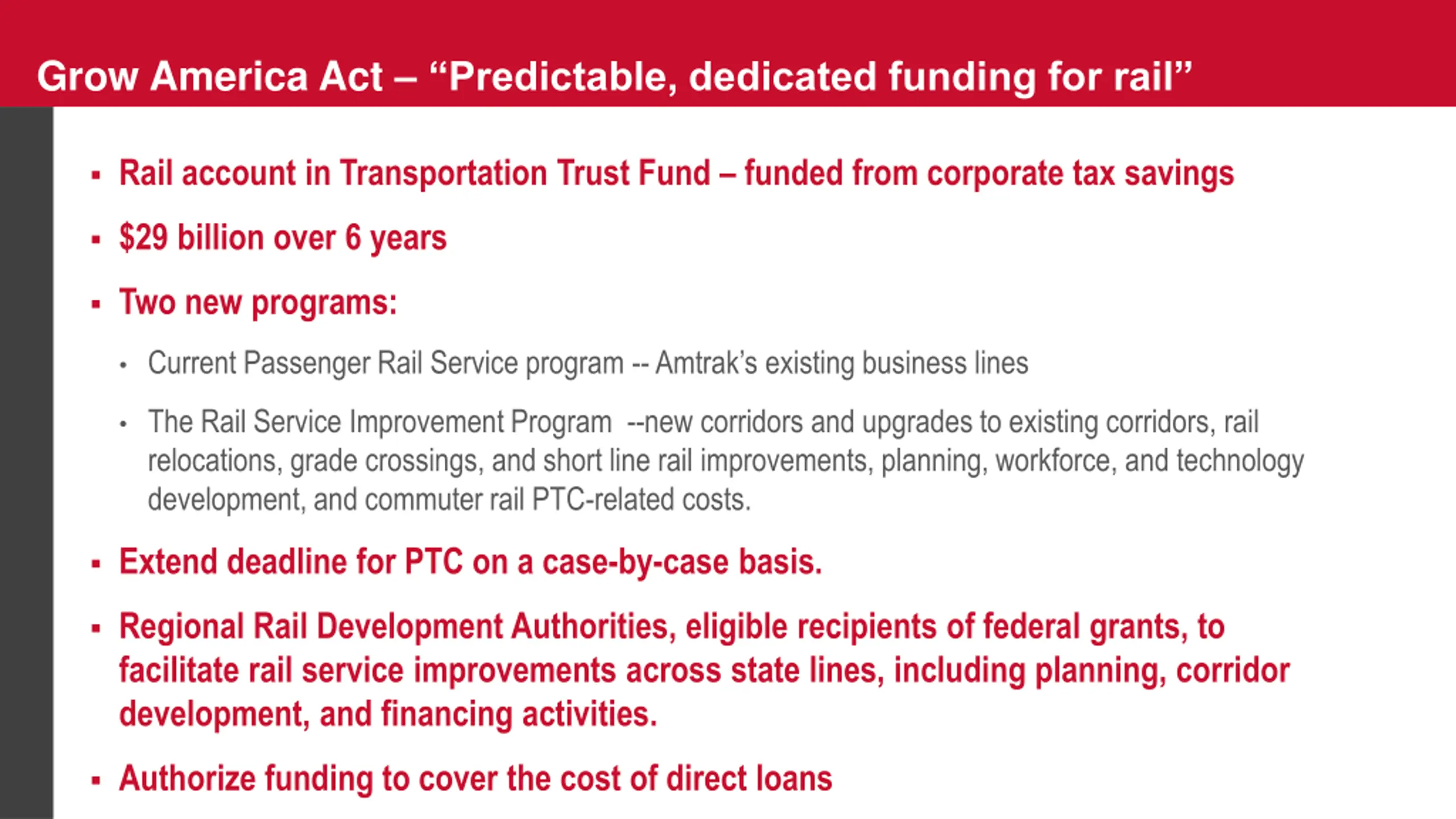 Grow America Act Predictable, dedicated funding for rail Rail account in Transportation Trust Fund funded from corporate tax savings $29 billion over 6 years Two new programs: Current Passenger Rail Service program --Amtrak s existing business lines The Rail Service Improvement Program --new corridors and upgrades to existing corridors, rail relocations, grade crossings, and short line rail improvements, planning, workforce, and technology development, and commuter rail PTC-related costs. Extend deadline for PTC on a case-by-case basis. Regional Rail Development Authorities, eligible recipients of federal grants, to facilitate rail service improvements across state lines, including planning, corridor development, and financing activities. Authorize funding to cover the cost of direct loans