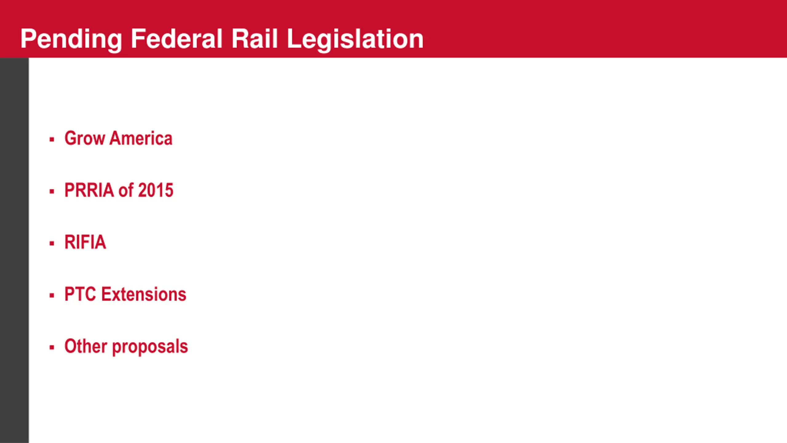 Pending Federal Rail Legislation Grow America PRRIA of 2015 RIFIA PTC Extensions Other proposals