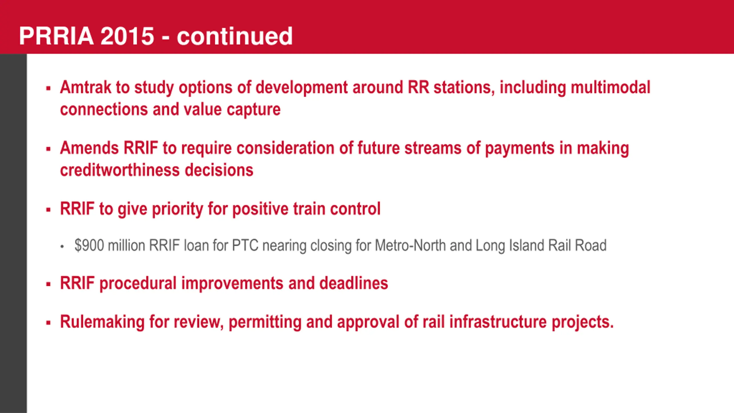PRRIA 2015 - continued Amtrak to study options of development around RR stations, including multimodal connections and value capture Amends RRIF to require consideration of future streams of payments in making creditworthiness decisions RRIF to give priority for positive train control $900 million RRIF loan for PTC nearing closing for Metro-North and Long Island Rail Road RRIF procedural improvements and deadlines Rulemaking for review, permitting and approval of rail infrastructure projects.