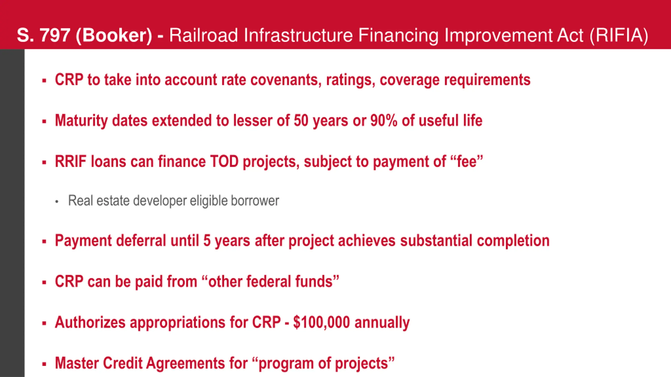 S. 797 (Booker) - Railroad Infrastructure Financing Improvement Act (RIFIA) CRP to take into account rate covenants, ratings, coverage requirements Maturity dates extended to lesser of 50 years or 90% of useful life RRIF loans can finance TOD projects, subject to payment of fee Real estate developer eligible borrower Payment deferral until 5 years after project achieves substantial completion CRP can be paid from other federal funds Authorizes appropriations for CRP - $100,000 annually Master Credit Agreements for program of projects