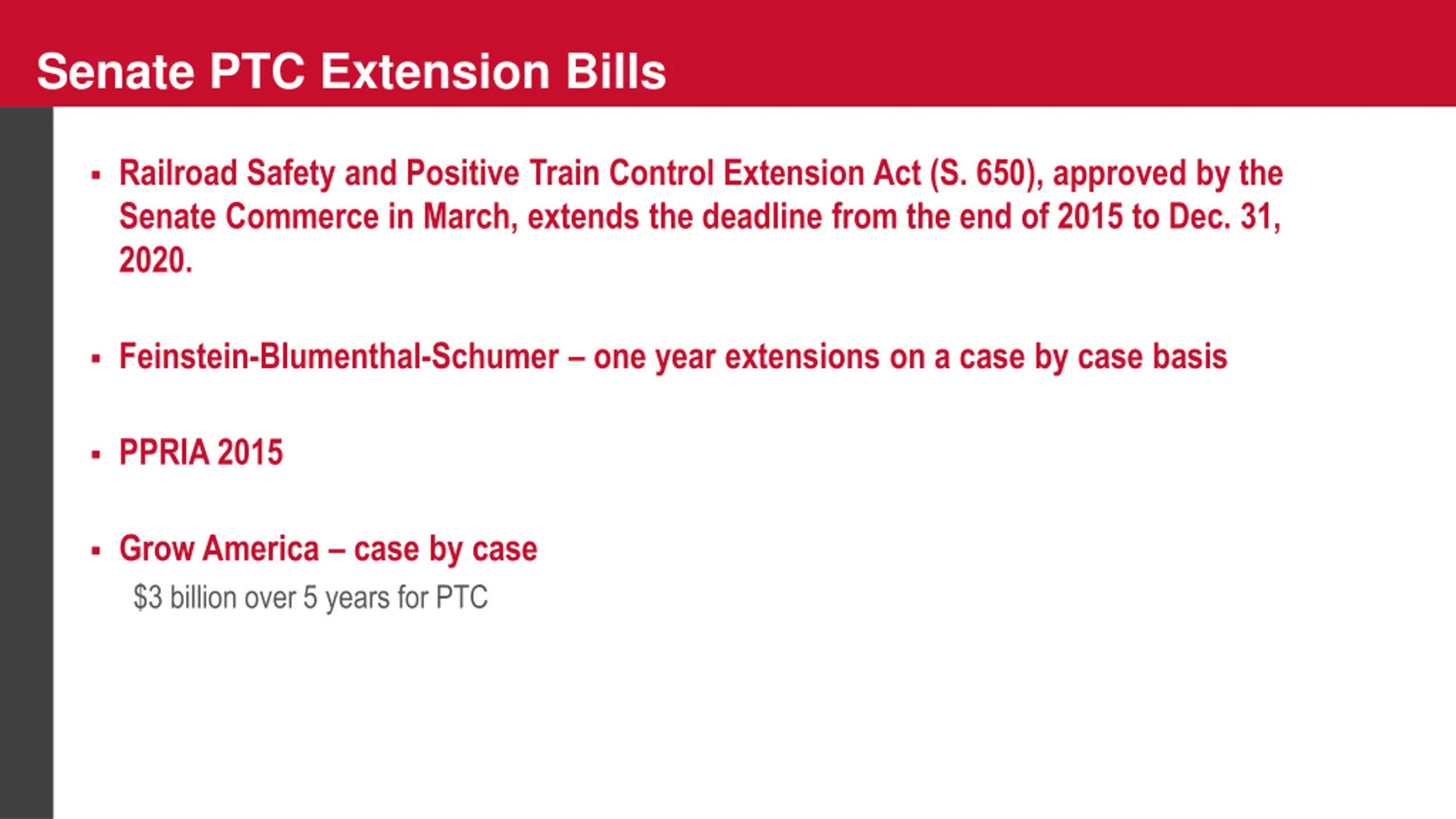 Senate PTC Extension Bills Railroad Safety and Positive Train Control Extension Act (S. 650), approved by the Senate Commerce in March, extends the deadline from the end of 2015 to Dec. 31, 2020. Feinstein-Blumenthal-Schumer one year extensions on a case by case basis PPRIA 2015 Grow America case by case $3 billion over 5 years for PTC