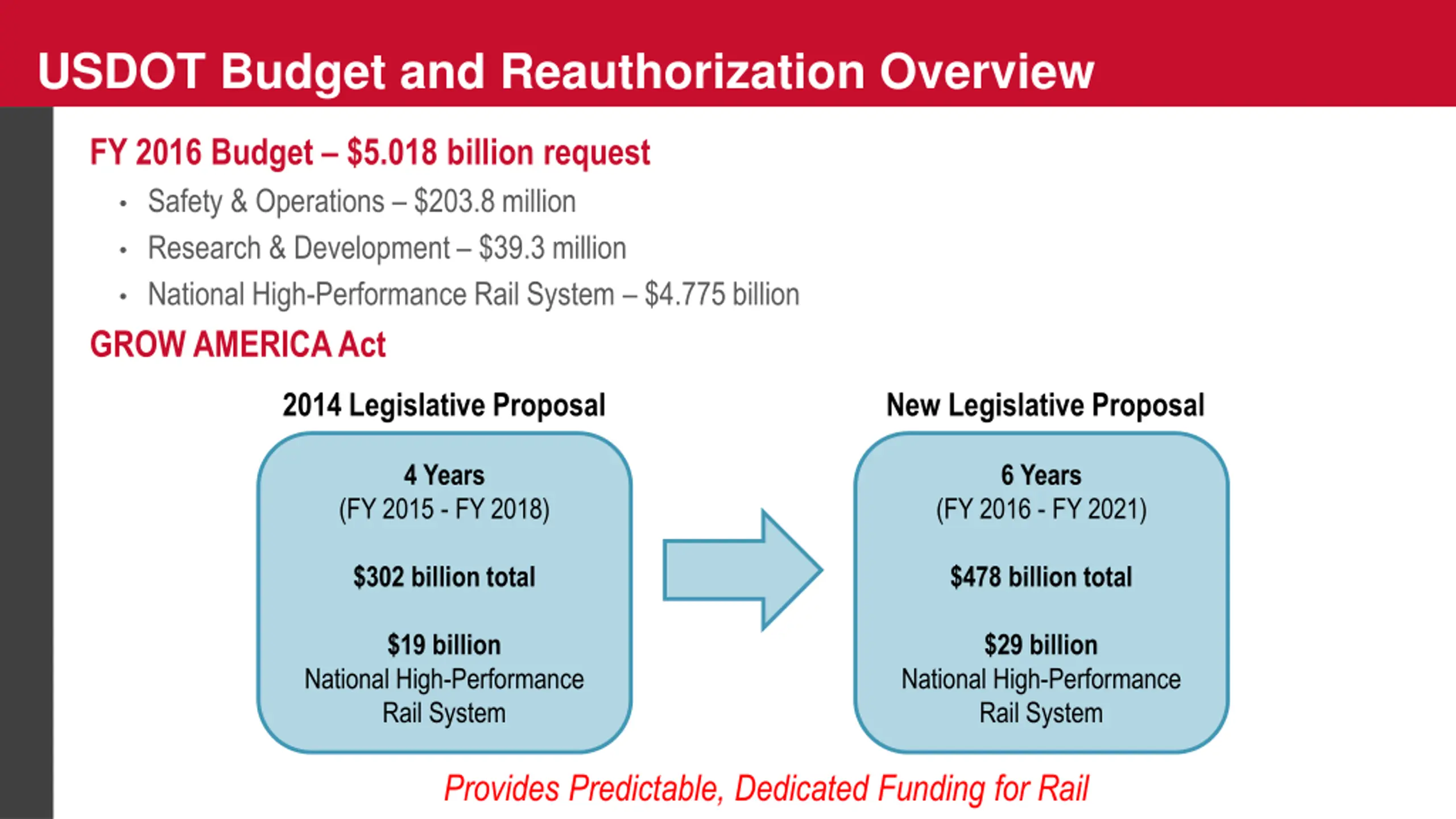 USDOT Budget and Reauthorization Overview FY 2016 Budget $5.018 billion request Safety & Operations $203.8 million Research & Development $39.3 million National High-Performance Rail System $4.775 billion GROW AMERICA Act 2014 Legislative Proposal New Legislative Proposal 4 Years 6 Years (FY 2015 - FY 2018) (FY 2016 - FY 2021) $302 billion total $478 billion total $19 billion $29 billion National High-Performance Rail System National High-Performance Rail System Provides Predictable, Dedicated Funding for Rail