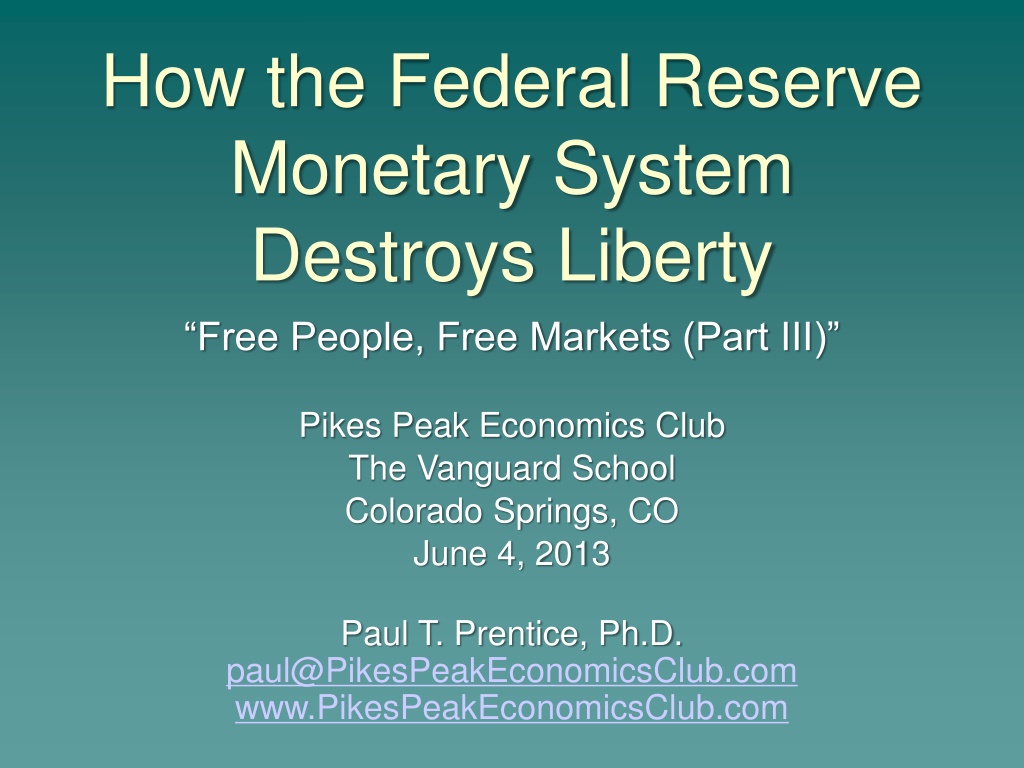 How the Federal Reserve Monetary System Destroys Liberty Free People, Free Markets (Part III) Pikes Peak Economics Club The Vanguard School Colorado Springs, CO June 4, 2013 Paul T. Prentice, Ph.D. paul@PikesPeakEconomicsClub.com www.PikesPeakEconomicsClub.com
