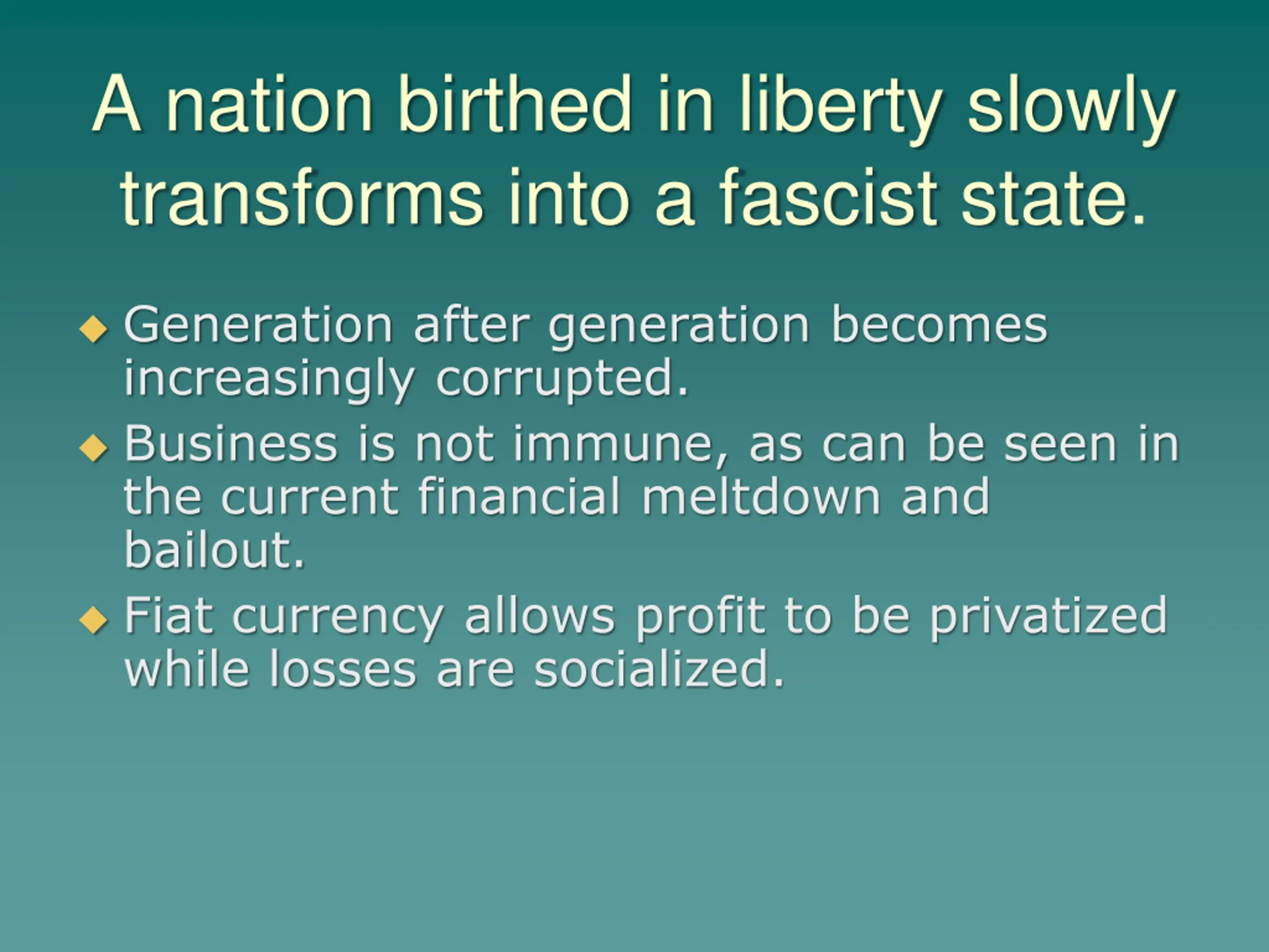 A nation birthed in liberty slowly transforms into a fascist state. Generation after generation becomes increasingly corrupted. Business is not immune, as can be seen in the current financial meltdown and bailout. Fiat currency allows profit to be privatized while losses are socialized.