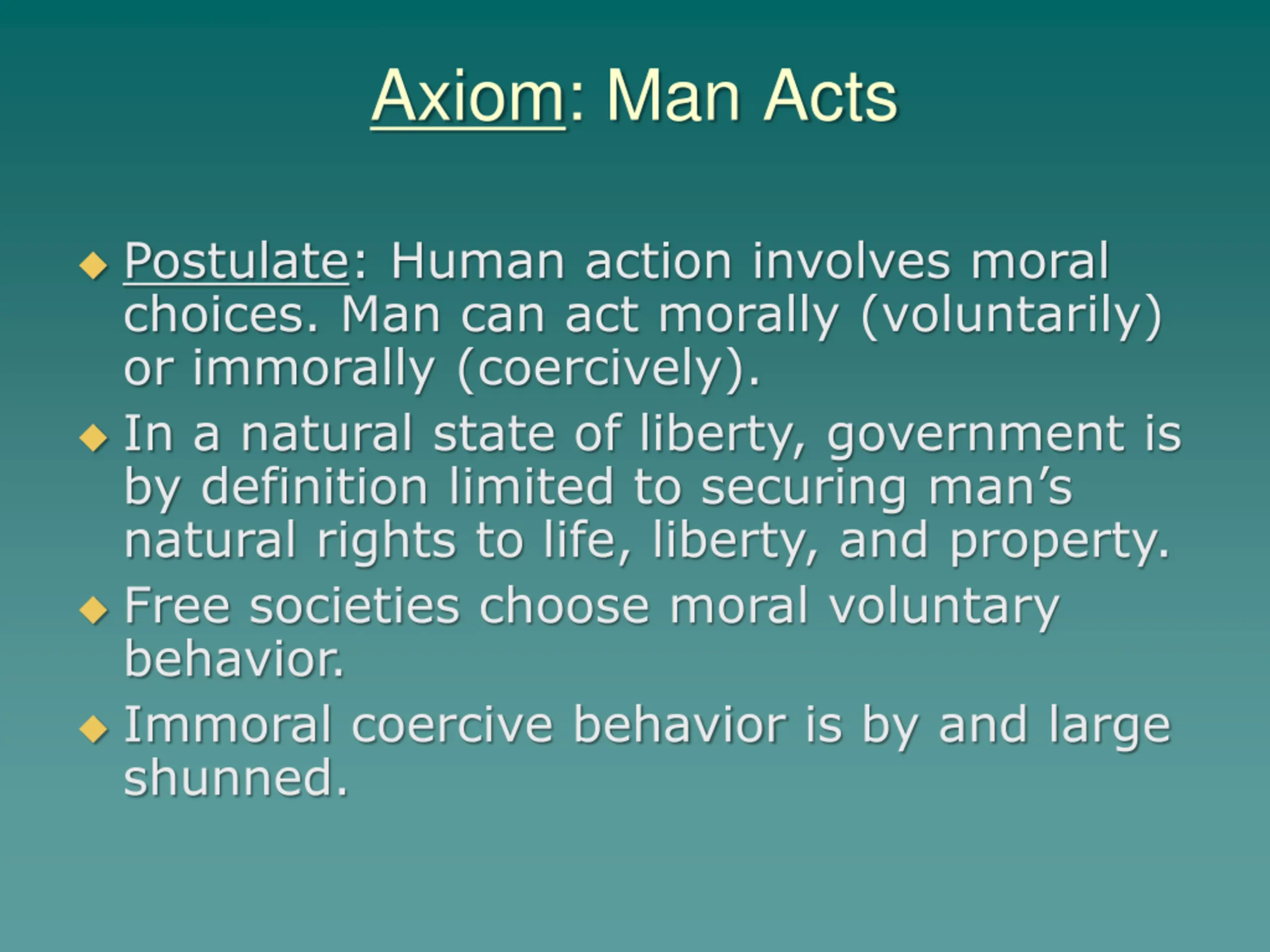 Axiom: Man Acts Postulate: Human action involves moral choices. Man can act morally (voluntarily) or immorally (coercively). In a natural state of liberty, government is by definition limited to securing man s natural rights to life, liberty, and property. Free societies choose moral voluntary behavior. Immoral coercive behavior is by and large shunned.