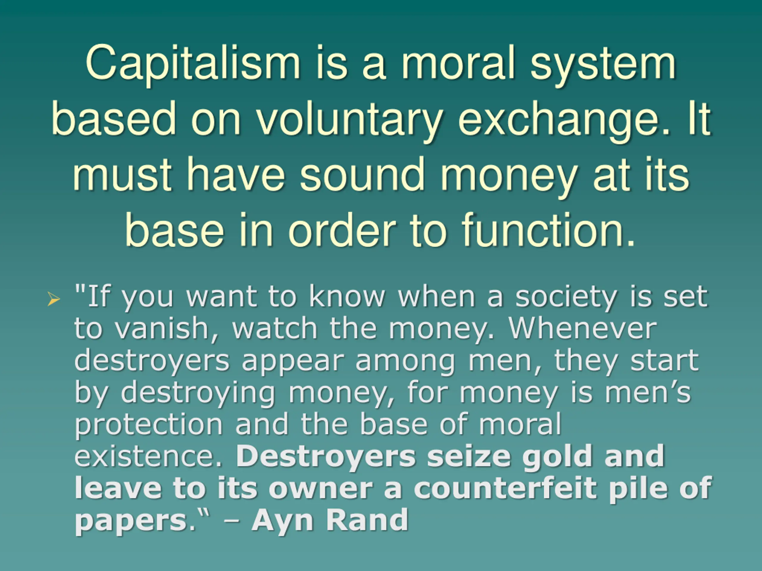 Capitalism is a moral system based on voluntary exchange. It must have sound money at its base in order to function. "If you want to know when a society is set to vanish, watch the money. Whenever destroyers appear among men, they start by destroying money, for money is men s protection and the base of moral existence. Destroyers seize gold and leave to its owner a counterfeit pile of papers. Ayn Rand